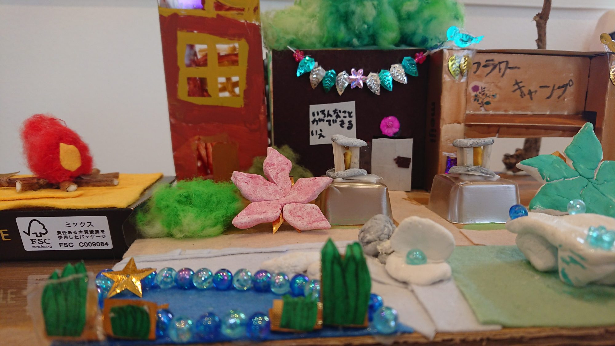 緑色に少しずつ違う色を足して色んな緑色を作りました。いろんな素材も使って楽しかったです😊