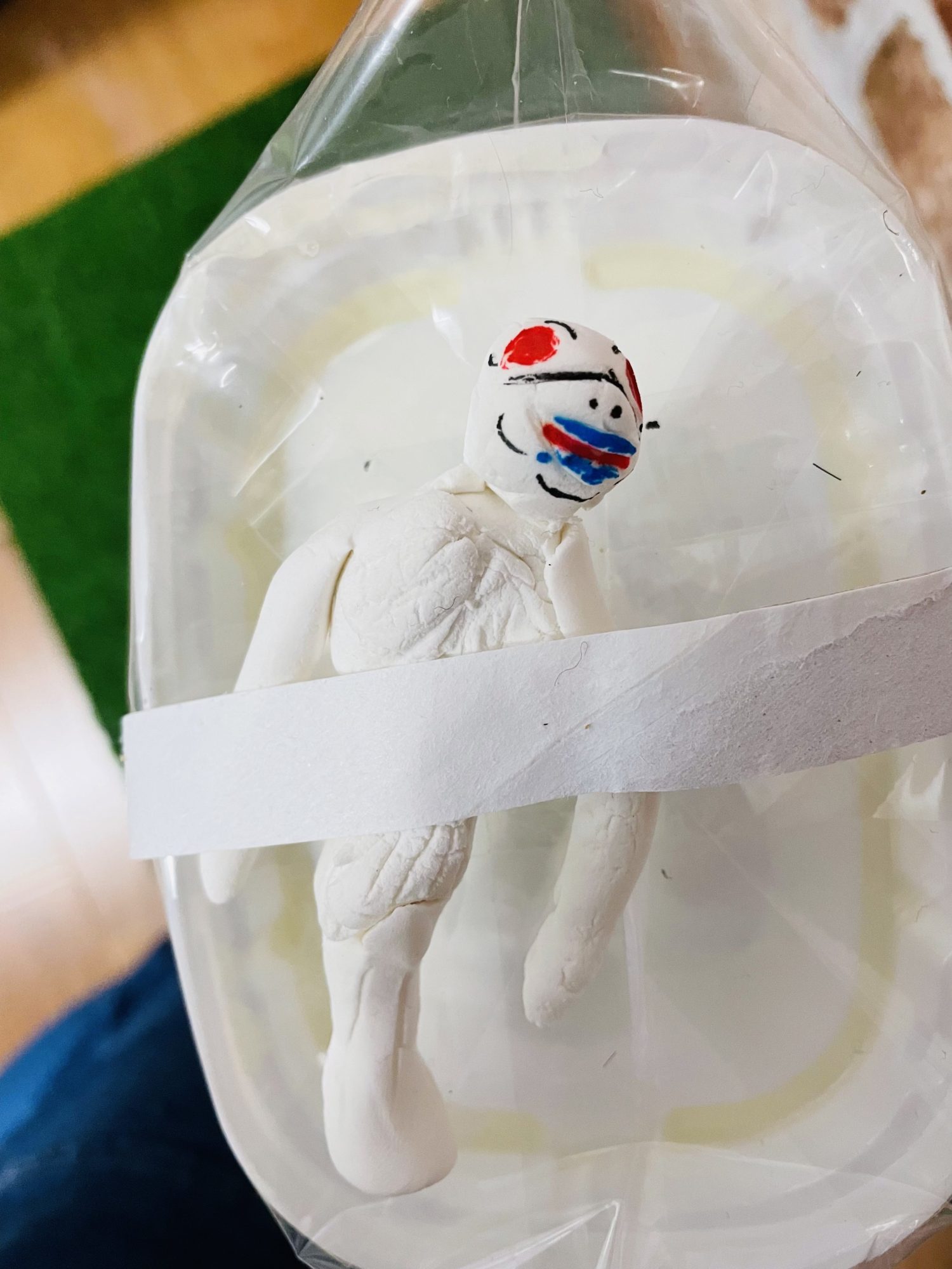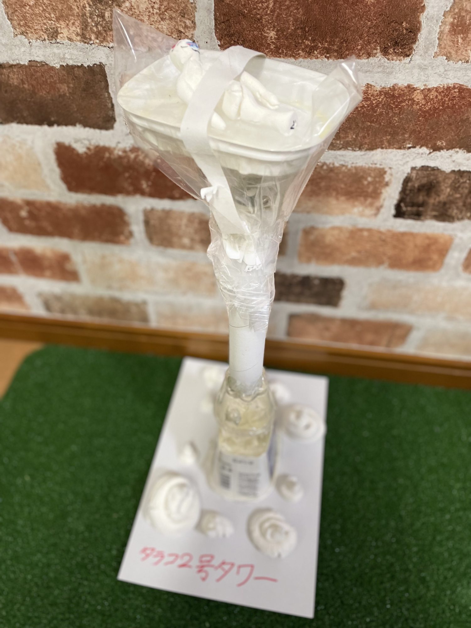 頂上にタラコ2号と言う名の化け物が乗ったタワーです。周りにはたくさんの白いウンチが乗っています。カップの中にはひとつひとつ液体のりが入っています。プッチンプリンのカップなので、液たいのりが落ちて行きます。粘土以外家のゴミで作りました。