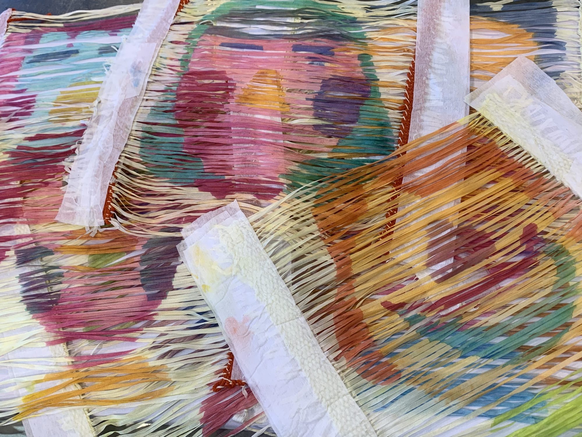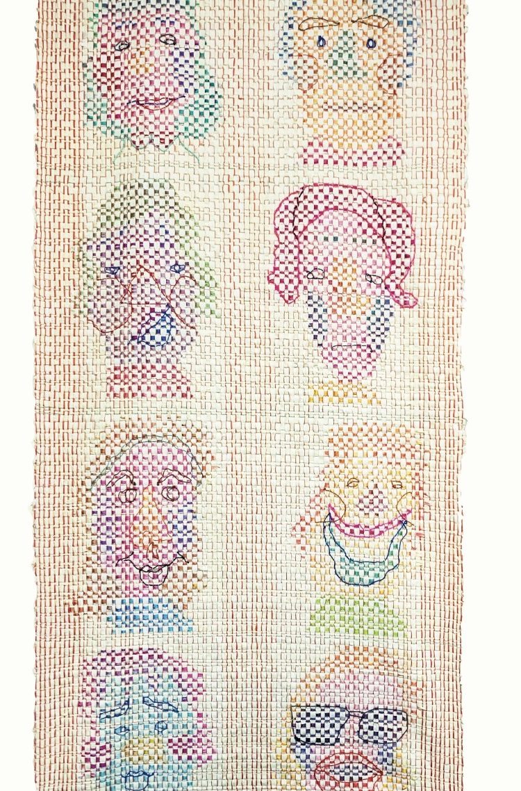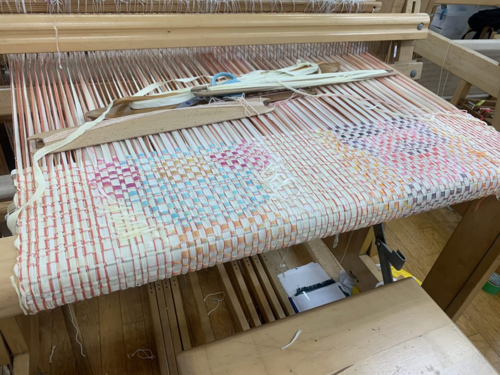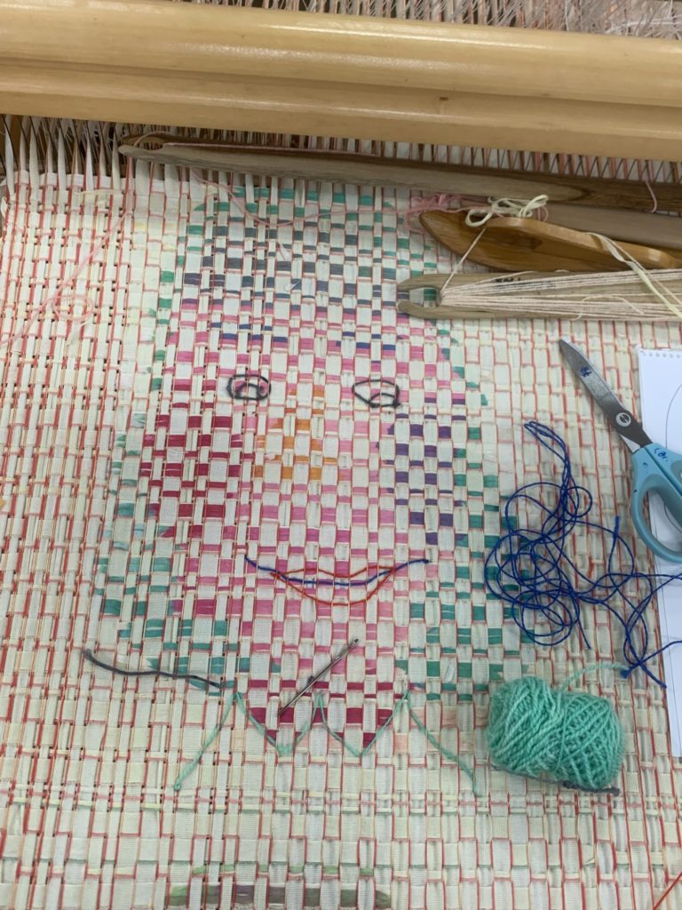 顔の部分の糸はリボンを染めて、 それを織り、その上から刺繍みたいなことをしてます!