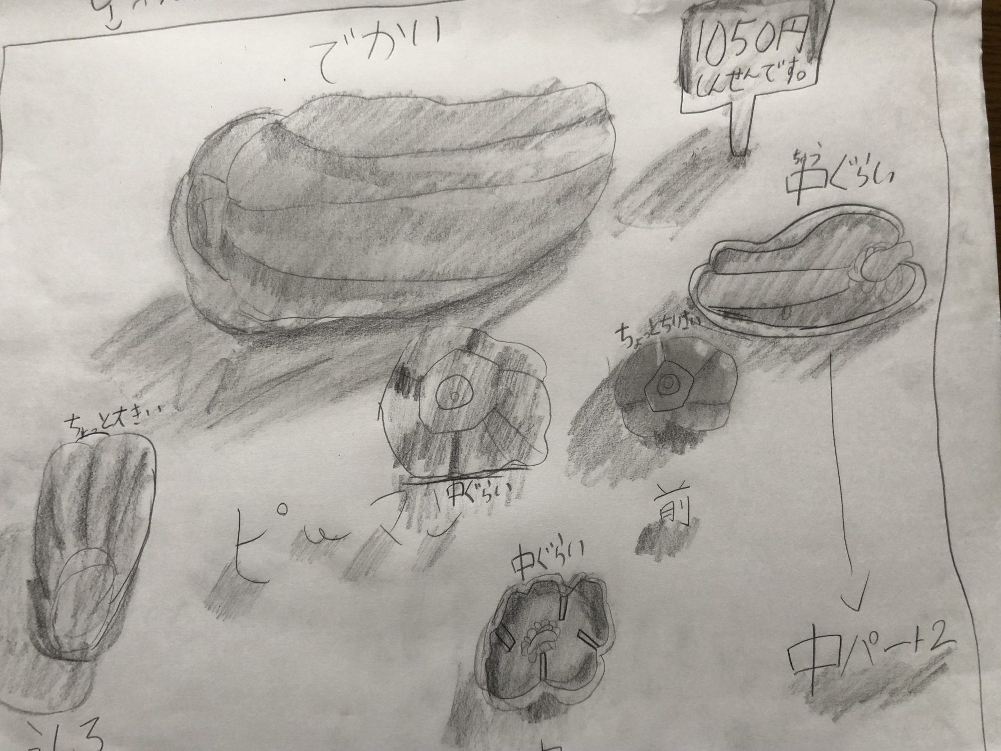 デッサンに挑戦!!鉛筆の使い方を工夫して薄い色から濃い色までしっかり表現を工夫しててすごい!!ピーマンも大きいものや中くらいのもの、小さいものなど、大きさも様々でとても工夫されて描かれていますね。ピーマンのくぼみや中の種の様子などもしっかり観察して描かれていてとても見ごたえのあるかっこいいデッサンだと思います。1050円、新鮮です