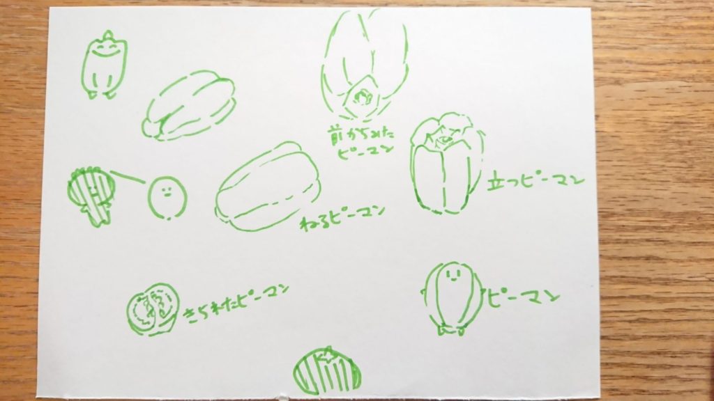 観察して描いたピーマンたち!シンプルな線で特徴をしっかり捉えていていますね!これはきっと疲れちゃうね😳