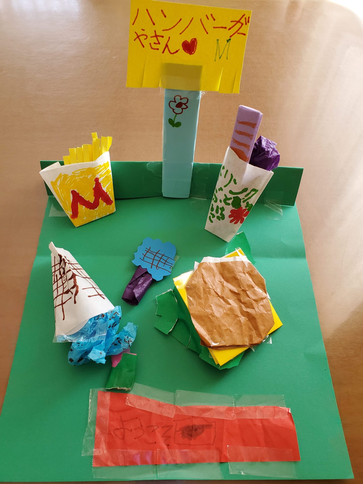 あとから店員さんの帽子を試行錯誤しながら作り、ハンバーガーショップがオープンしました。