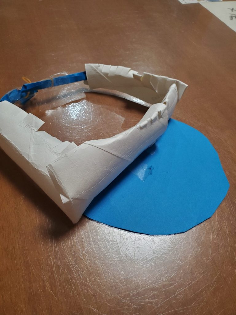 楽しいレッスンのおかげで、どうやったら作りたい形になるのか、ずいぶんと考え工夫したり、うまくいかなければどうしたらよいのか、考えるようになったりしたように見受けられます。キッチンペーパーの芯と輪ゴムで帽子を作っていました。