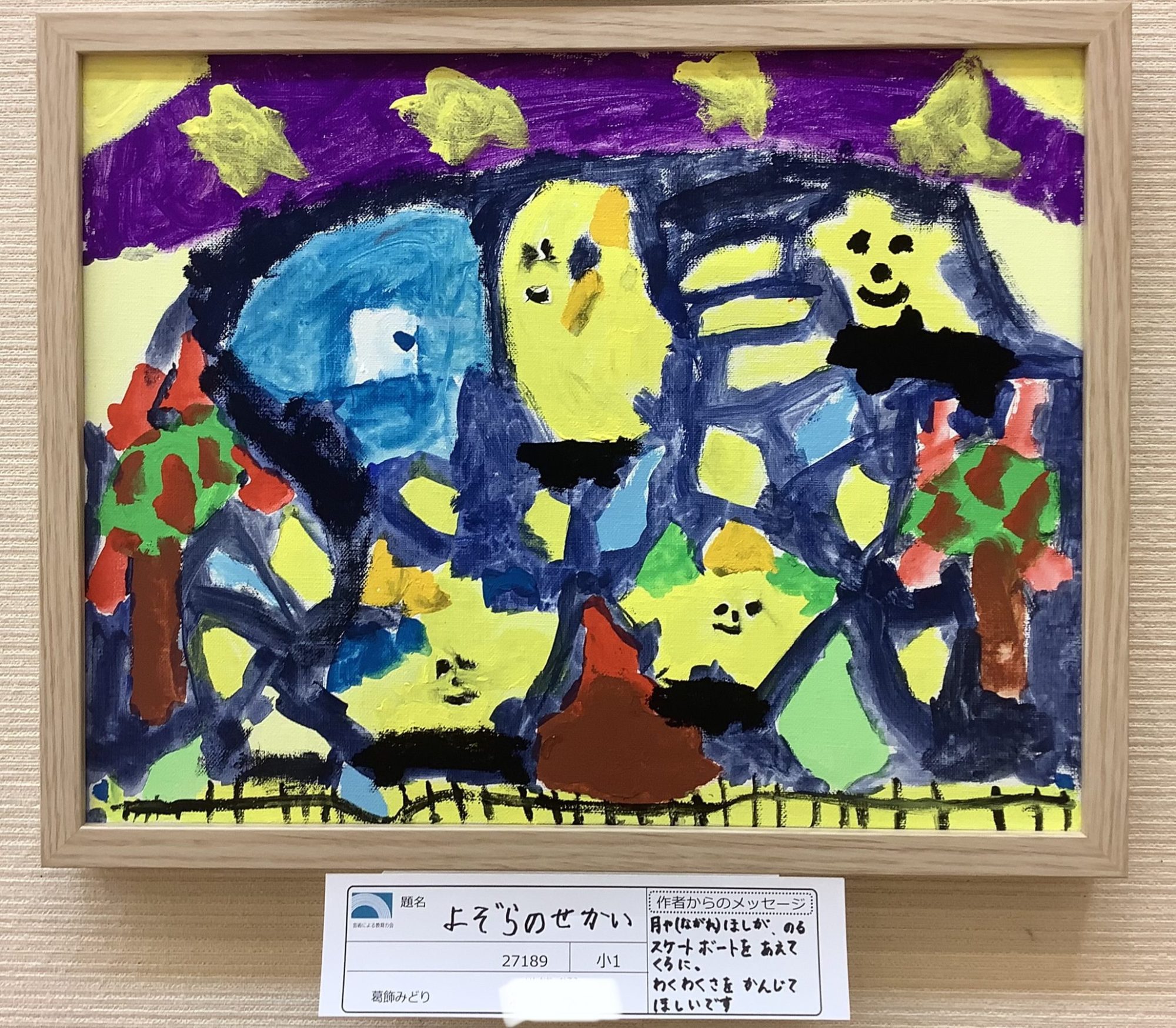月や、星が乗るスケートボードを、あえて黒に塗りました。 (オリンピックのスノーボード競技をテレビ観戦し、付け加えた。) みんなにワクワクさを、感じてほしいです。