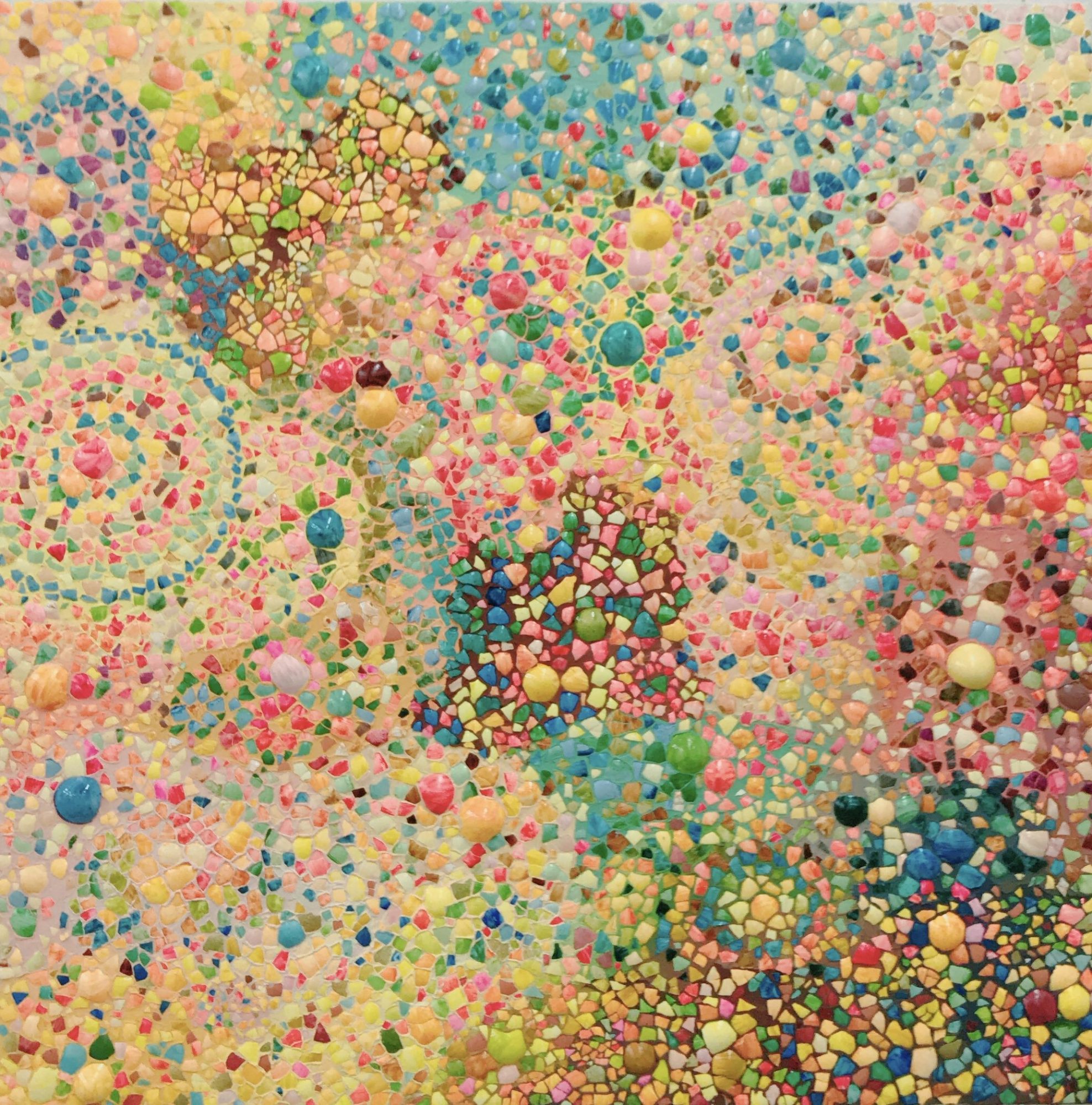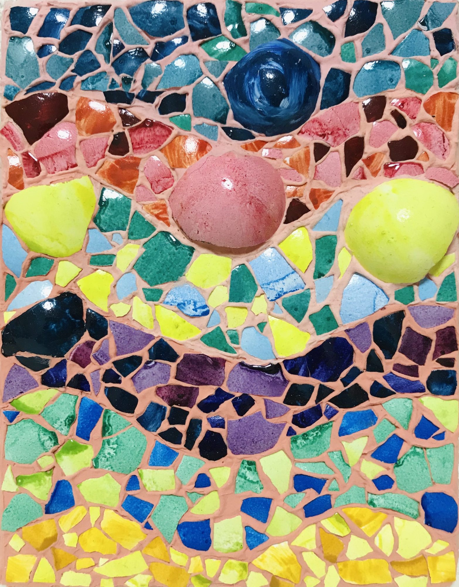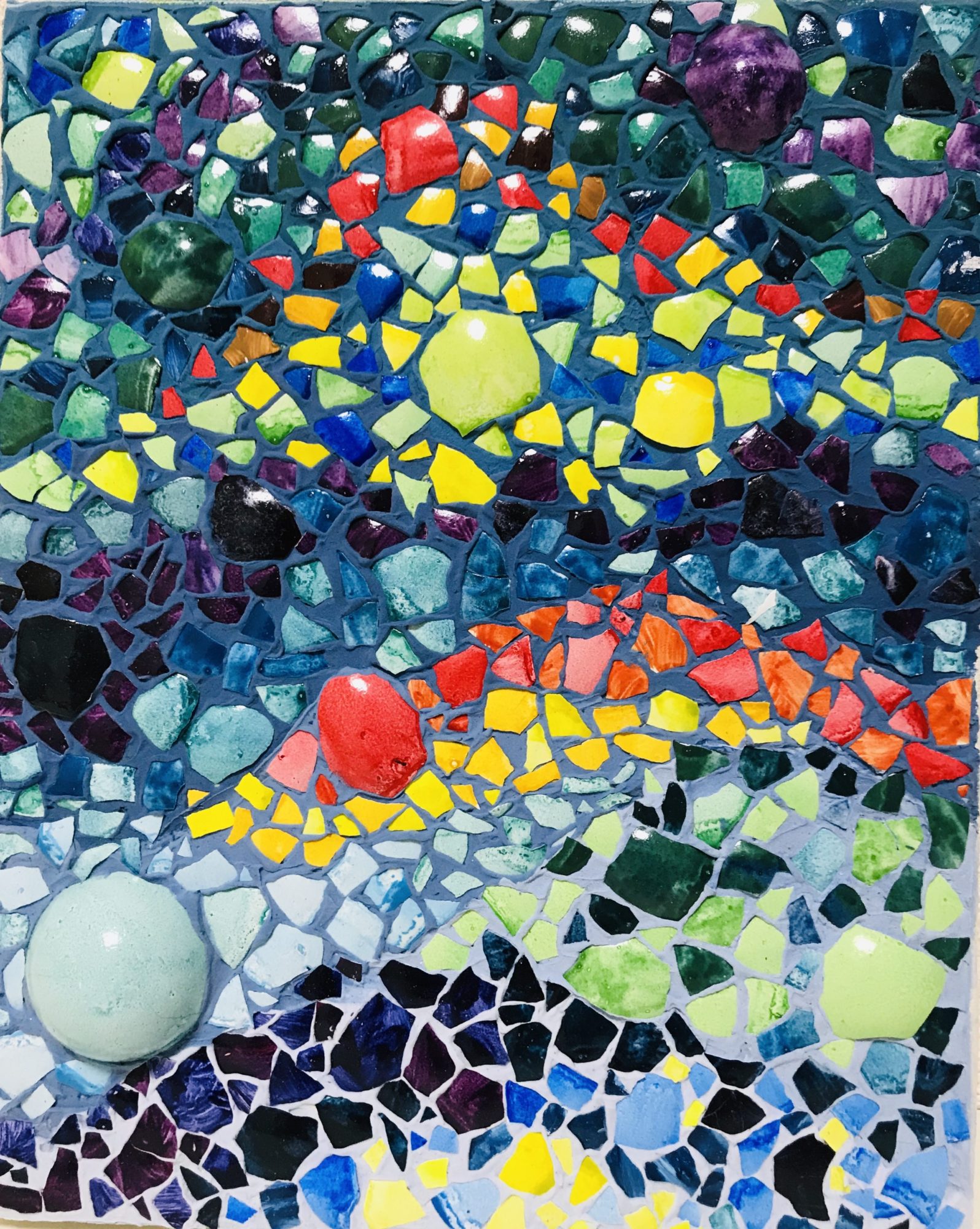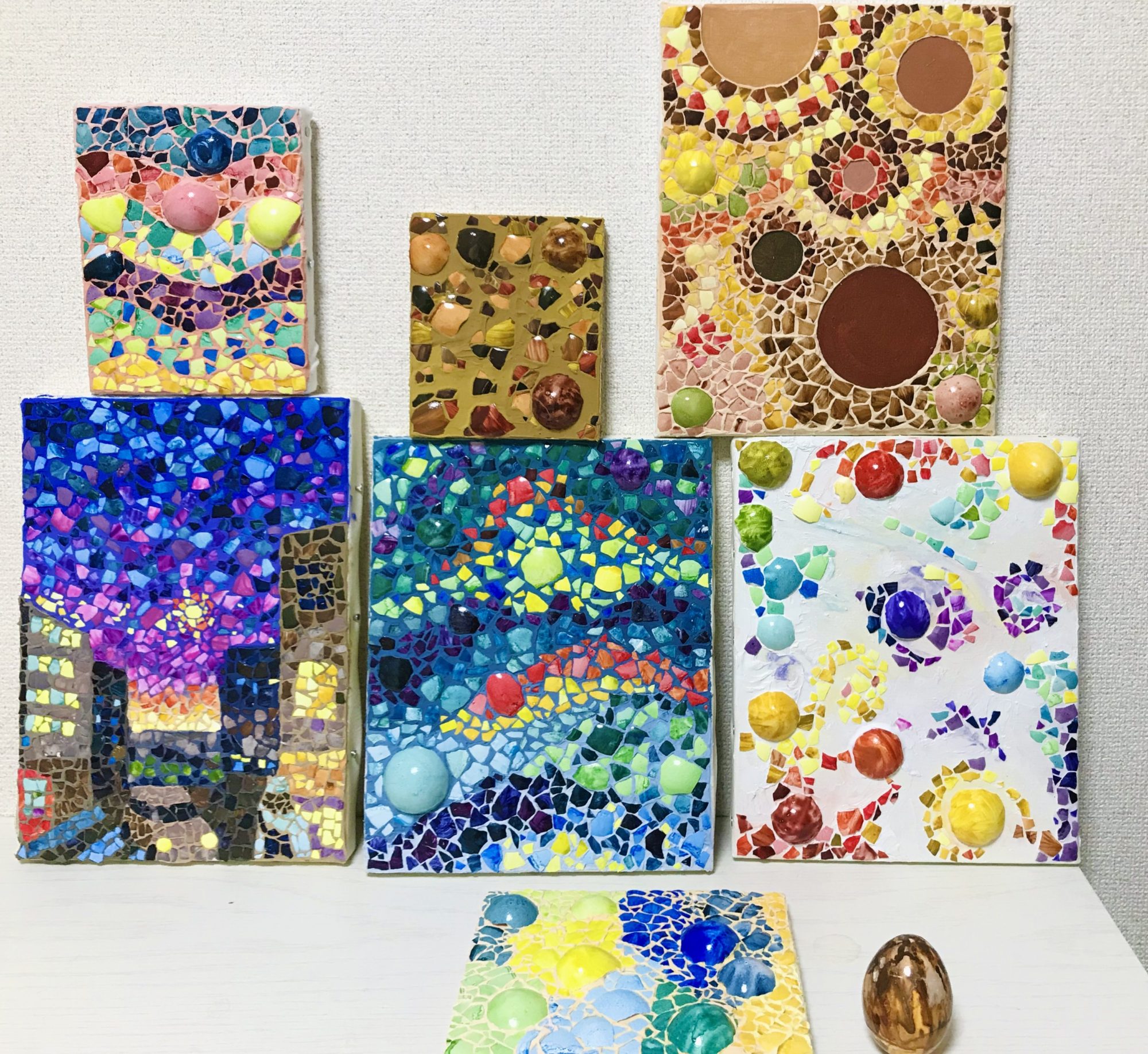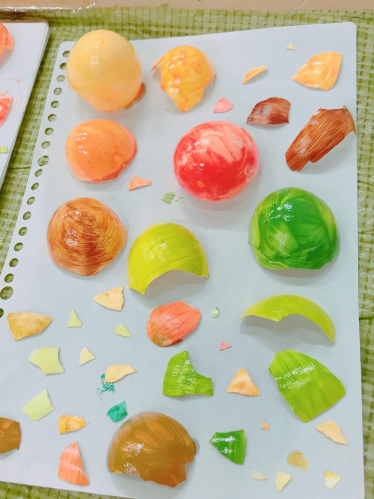 卵の殻に絵の具で色を塗って、キャンバスに貼り付けていきました。
