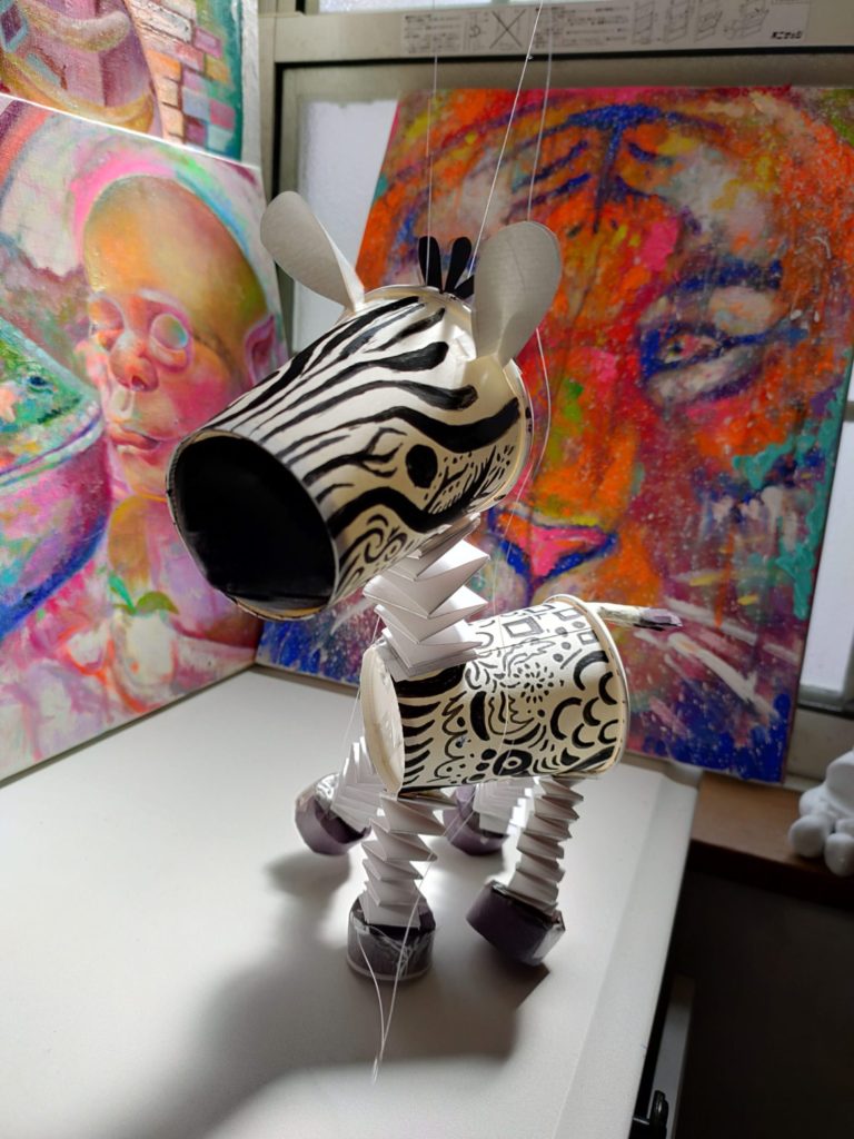 素敵な作品!首や足がびょんびょん伸びる紙の形で出来ていて、ぴょんぴょん飛び跳ねながら動き回りそうですね
