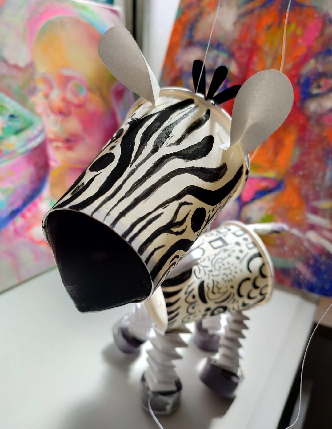 素敵な作品!首や足がびょんびょん伸びる紙の形で出来ていて、ぴょんぴょん飛び跳ねながら動き回りそうですね