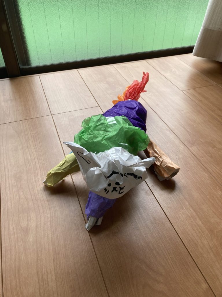 かみをくしゃくしゃしていたら、ひらめいてカラフルな猫をつくりました。