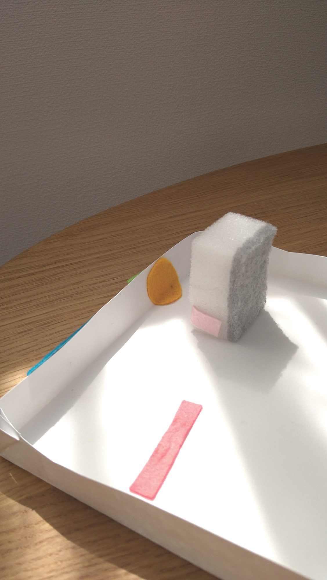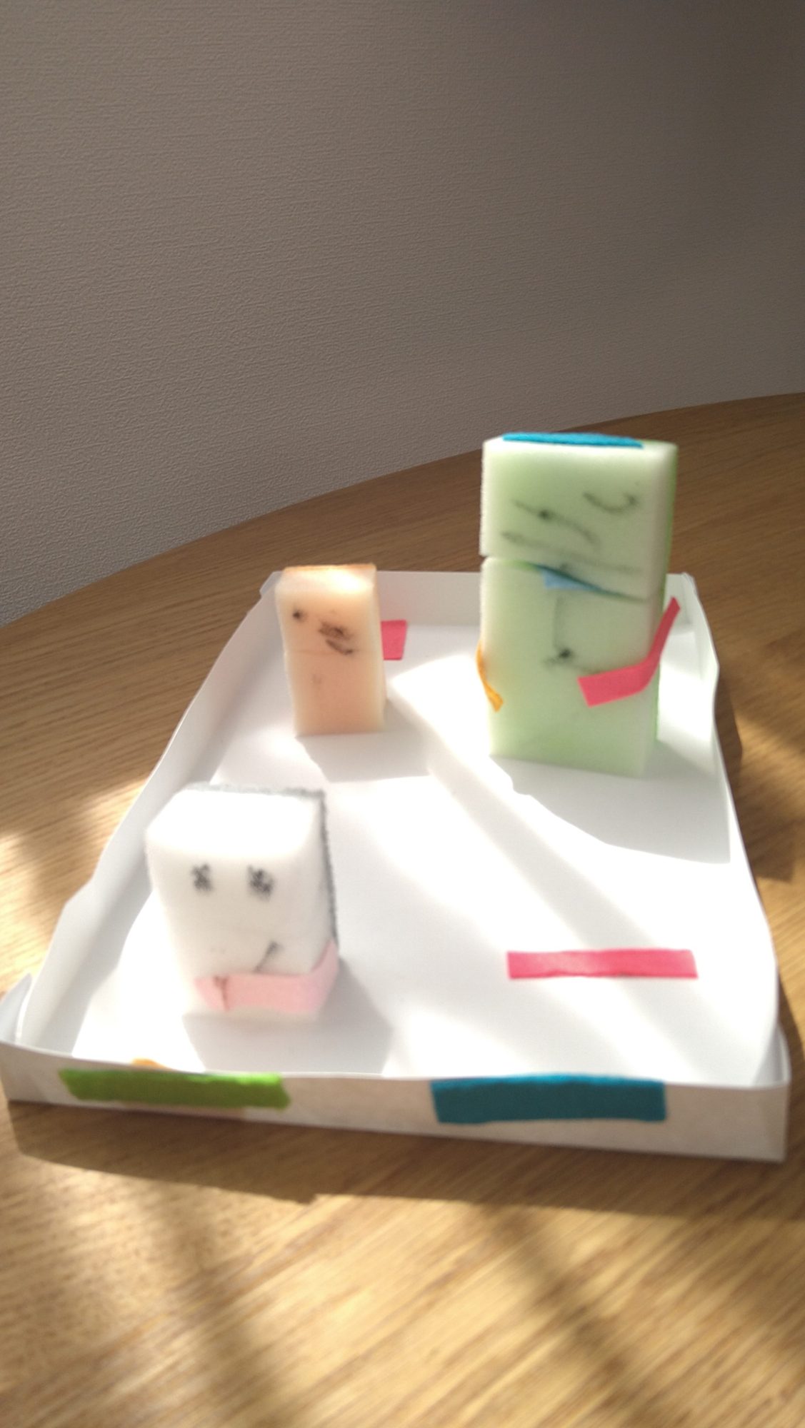 画用紙でつくった箱をうまく利用しましたね。スポンジのかぞくみんなでたのしくおしゃべりしているのがきこえてきそうだね。