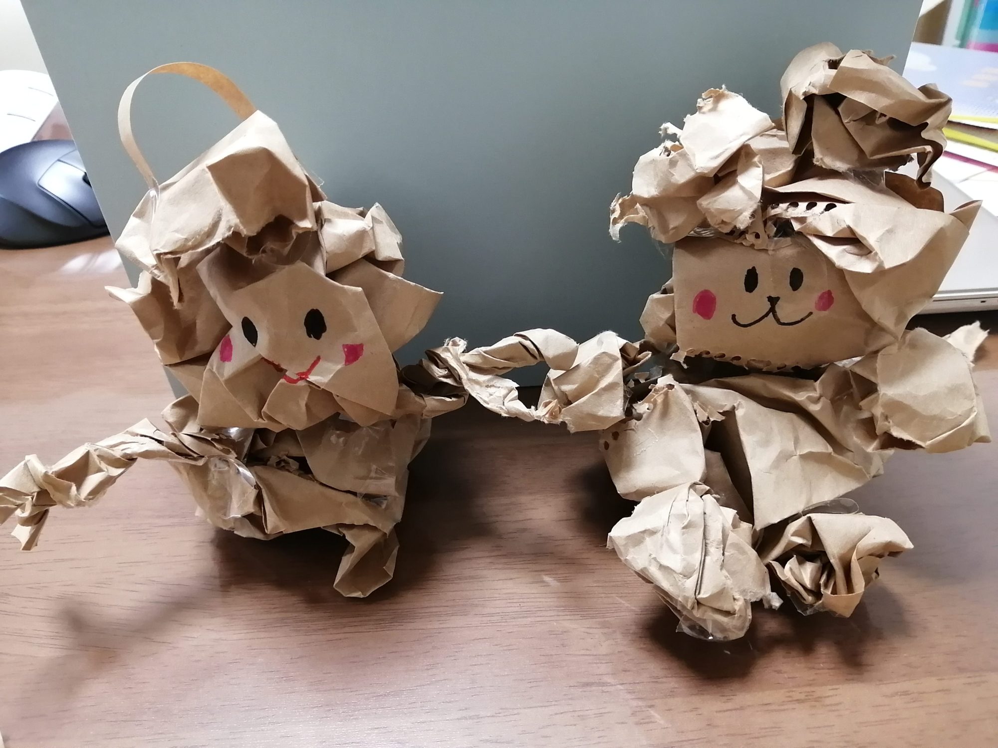 丸いところに顔を描くのがむずかしかったです。紙をくしゃくしゃするのが楽しかったです。