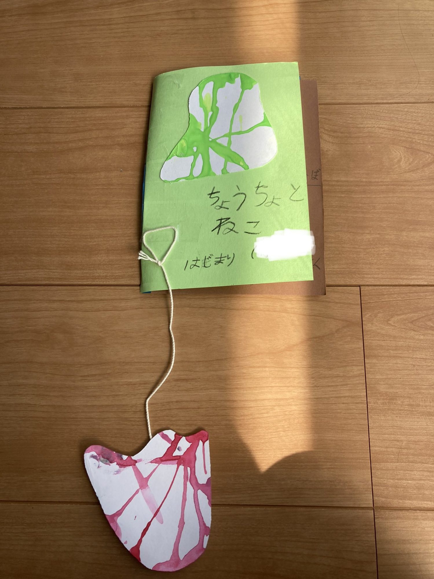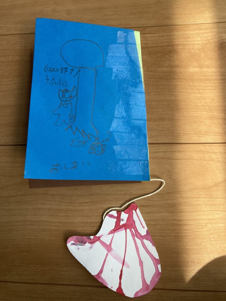 「がようしのかたちをみたら思いついたので絵本を作りました」とのこと、垂れて混ざった絵の具を見ていたらひらめいちゃったんですね。
