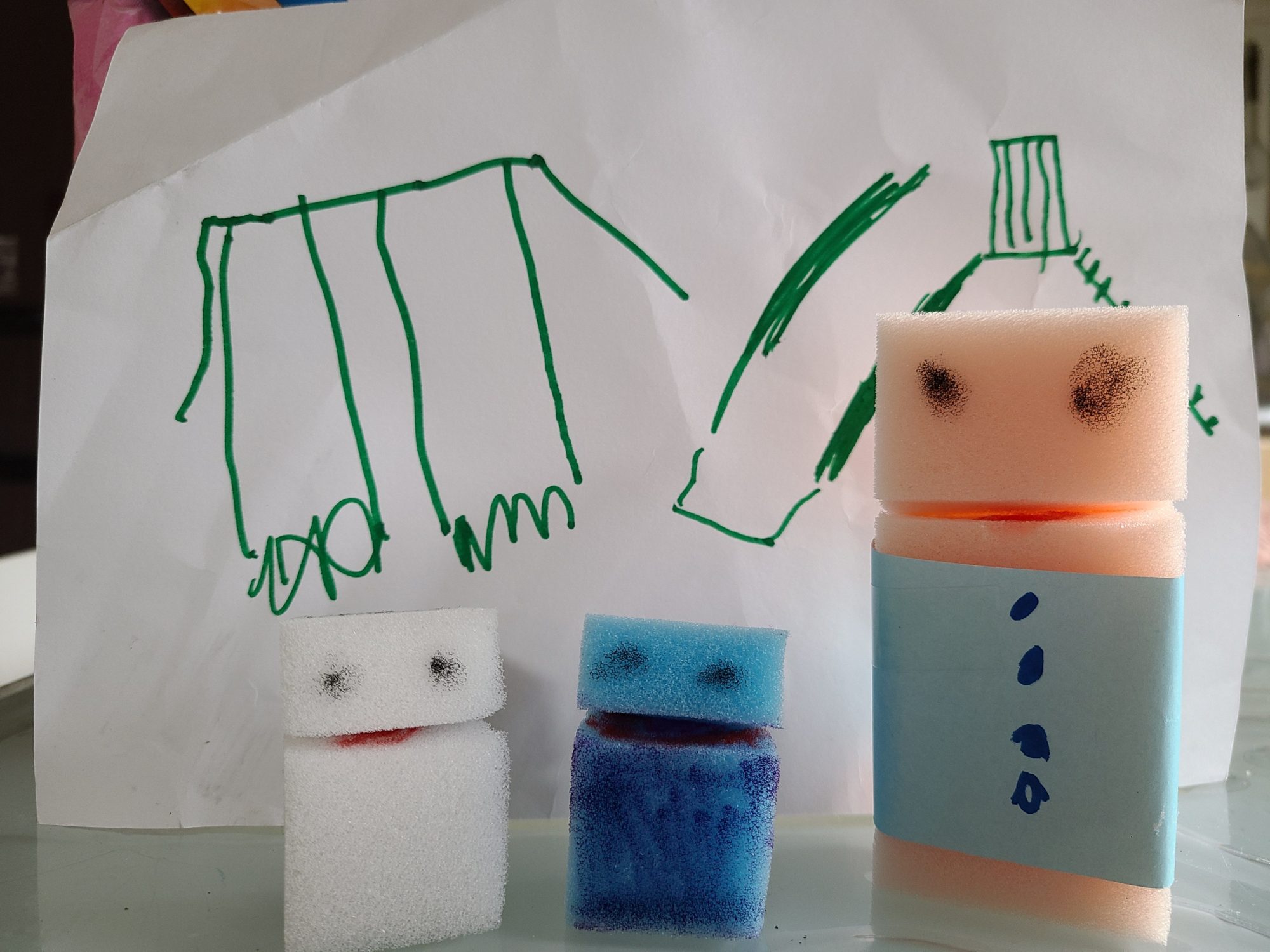 大きいスポンジちゃんには折り紙でお洋服を作ってあげたんだね!水色に青のボタンがオシャレ〜!✨