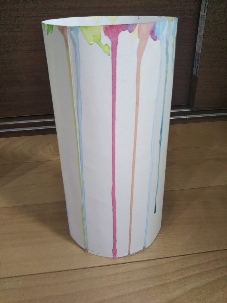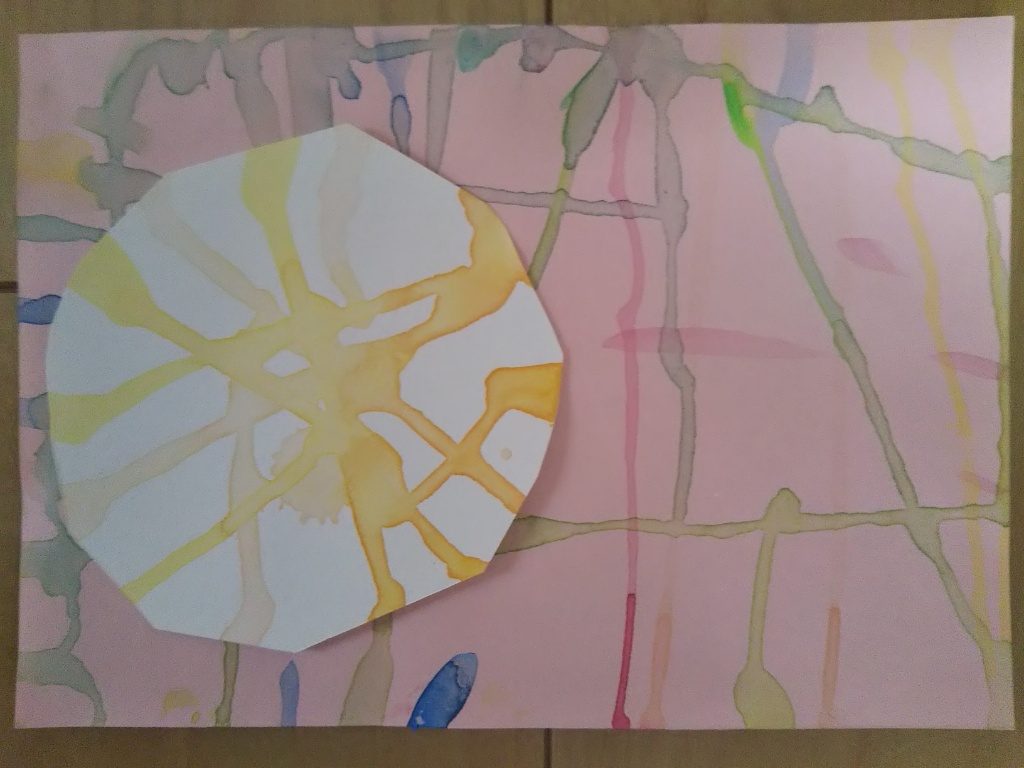 こんな色を垂らしたい、とたらした色も一つひとつ美しさも感じますが、偶然できた紙皿に落ちた色も紙皿の痕跡もアート作品になっていること発見したこと素晴らしいですね!