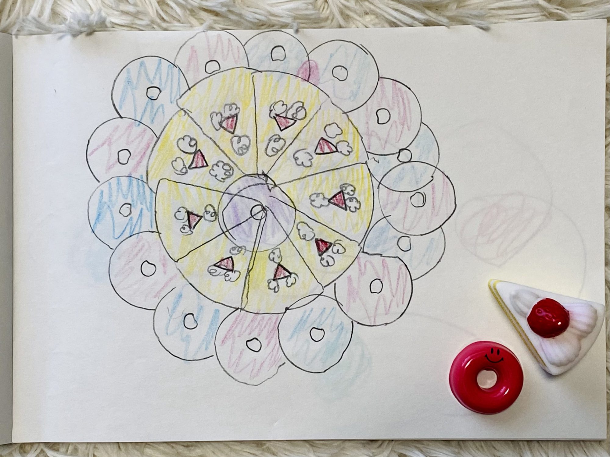 なるほど! おもちゃのケーキとドーナツの形をなぞって、絵をかいていったのですね! あ・た・ら・し・い!
