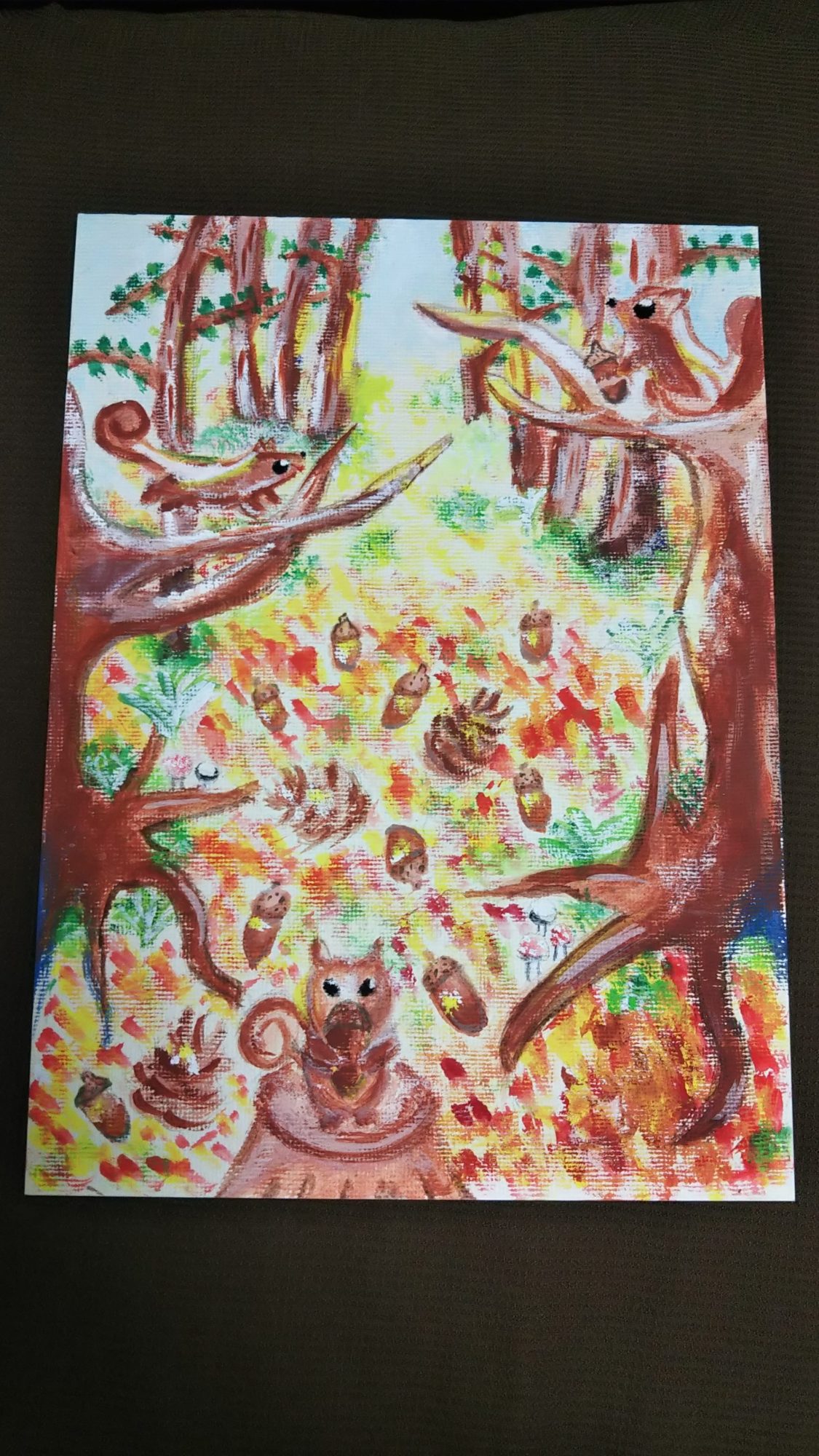 親戚のおばさんの入院が春から秋へと長引いているので、退院して自由に外に出られることを願って、りすが森で自由に楽しく遊んでいる様子を描きました。