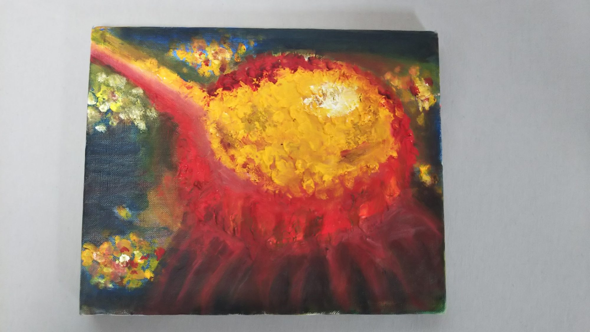 油絵に初挑戦しました! 隕石が地球に落ちる夢を何回も見てたので、そのインパクトを描いてみようと思いました。 楽しく、すいすい、アクリルや水彩同様塗りました。 今のところ油絵の具の難しさはわかりません。が、奥が深いのはわかりました。 今年の美術展は油絵で制作してみたいです。