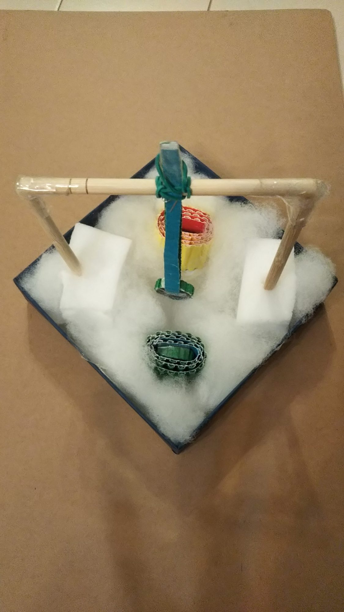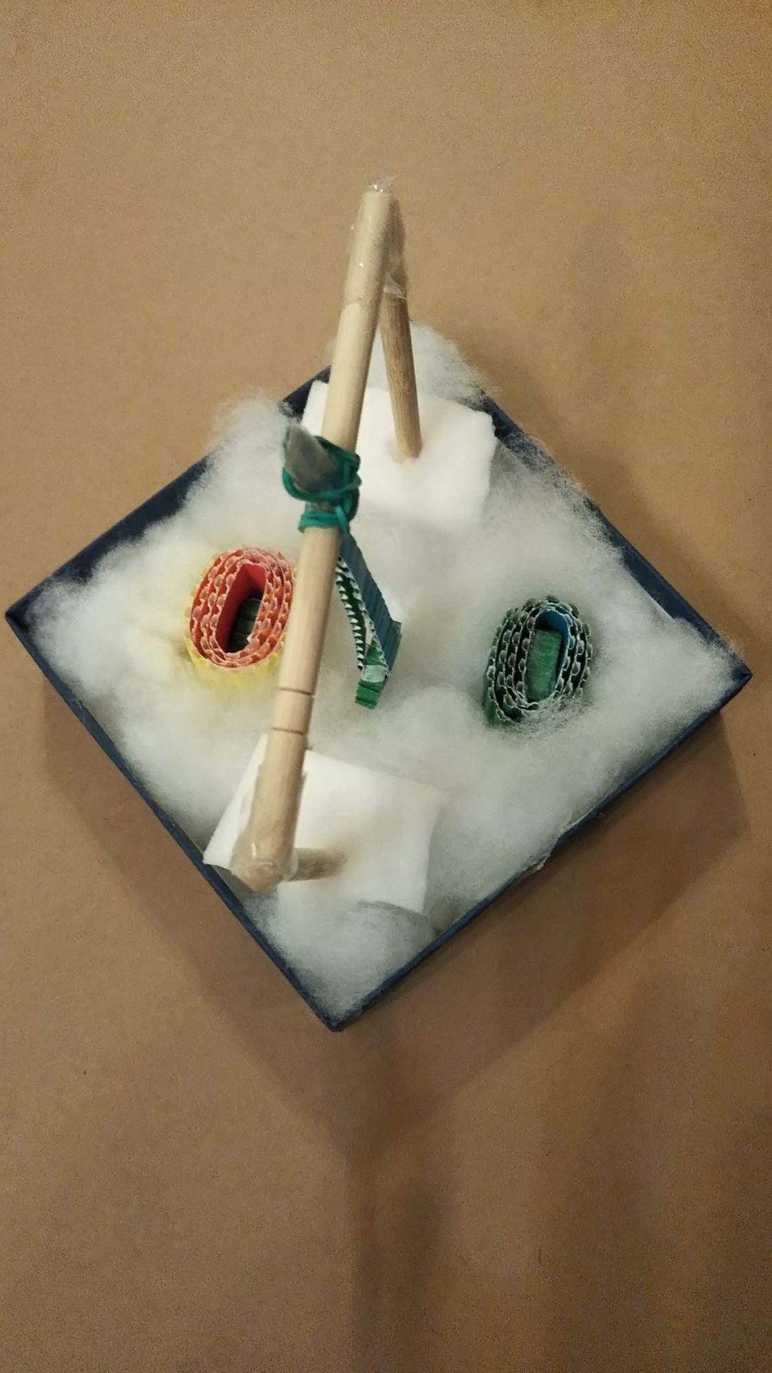磁気が弱まるようボール紙で磁石をくるんだり、綿を使いました。
