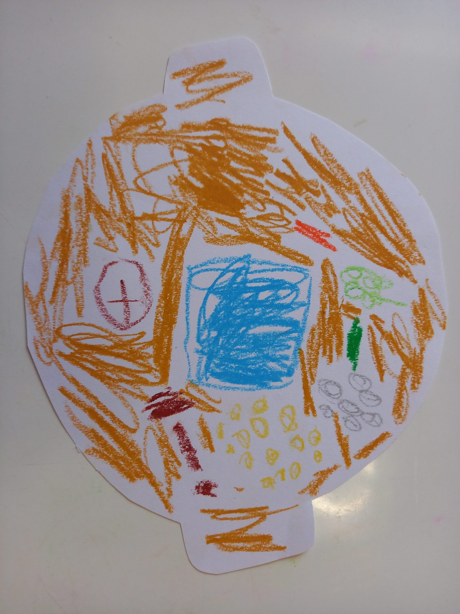 2枚目のお鍋は絵の具とクレヨンを一緒に使うことに抵抗があるようでしたが、楽しんで具材を描いていました。(お豆腐、しいたけ、にじん、ブロッコリー、お肉、きゅうり、コーン、ご飯)