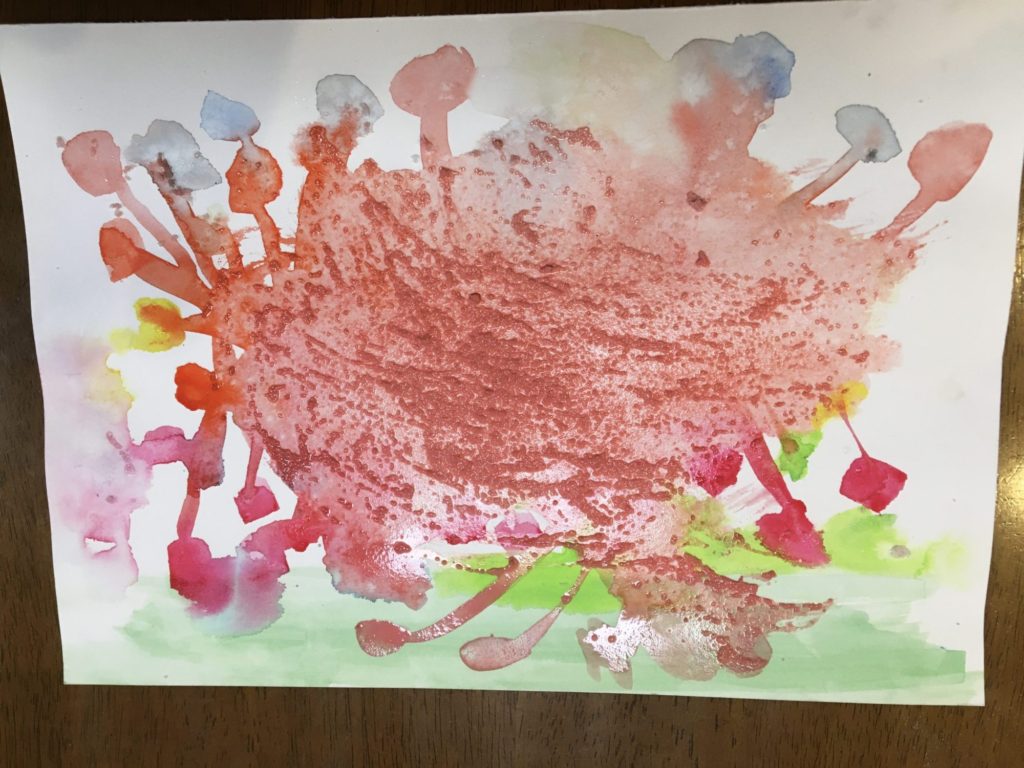 チューリップに水をやっている様子をイメージしました。ふでとふでをこすり合わせて、絵の具を飛ばしたら、水しぶきのようになりました。