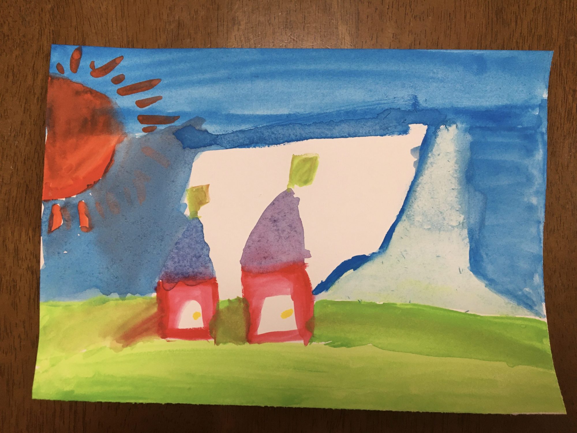3枚目は、青空の風景をイメージしました。色が濃い部分は、太陽も少し暗くなって、家に影をつけたり、家と家の間隔を狭くしました。家から東京スカイツリーが見えるように描きました。野原も濃い部分と薄い部分を作って、影を表現しました。