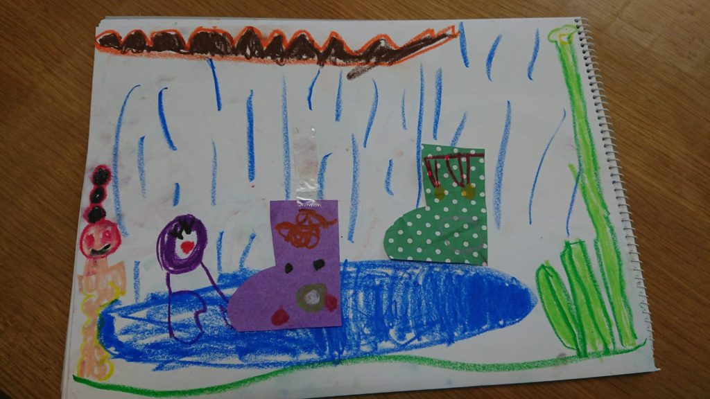 水たまりで遊ぶ長靴ちゃんたちのそばには素敵な髪型のお友達がいるね!どんな子なのか気になるなぁ〜👀