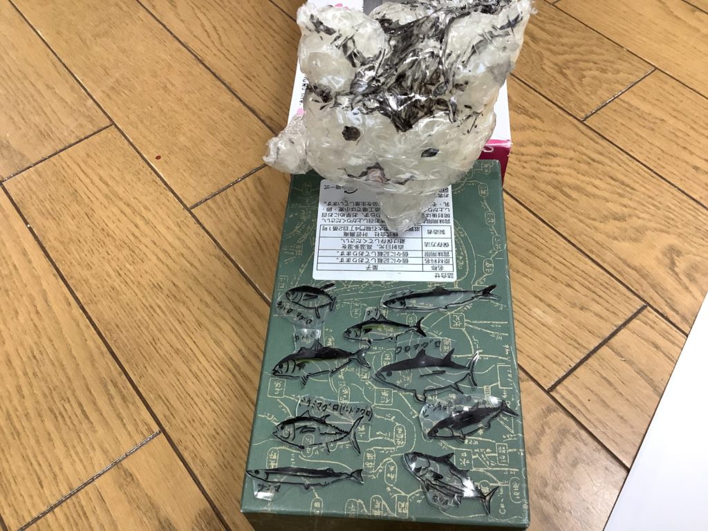 お家で飼っているゴマちゃんだそうです! プラバンで作ったお魚を食べているところ