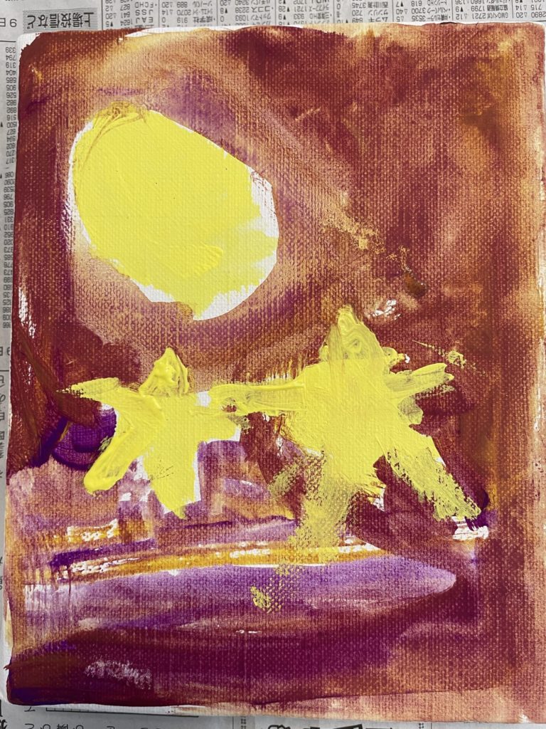 ikedamaki 先生2022年6月30日 9:06 AM hirotoさん、こんにちは! 輝くような星空にひきつけられました! 筆の勢いが、とっっっても気持ちいい〜〜〜!!! 空気の動きすら感じる星の瞬きです。 私も紫と黄色をうまい具合に混ぜた時に、茶色がかった黄金色に感じることがあります。 とても美しい色合いですね。 ログインして返信する ↓