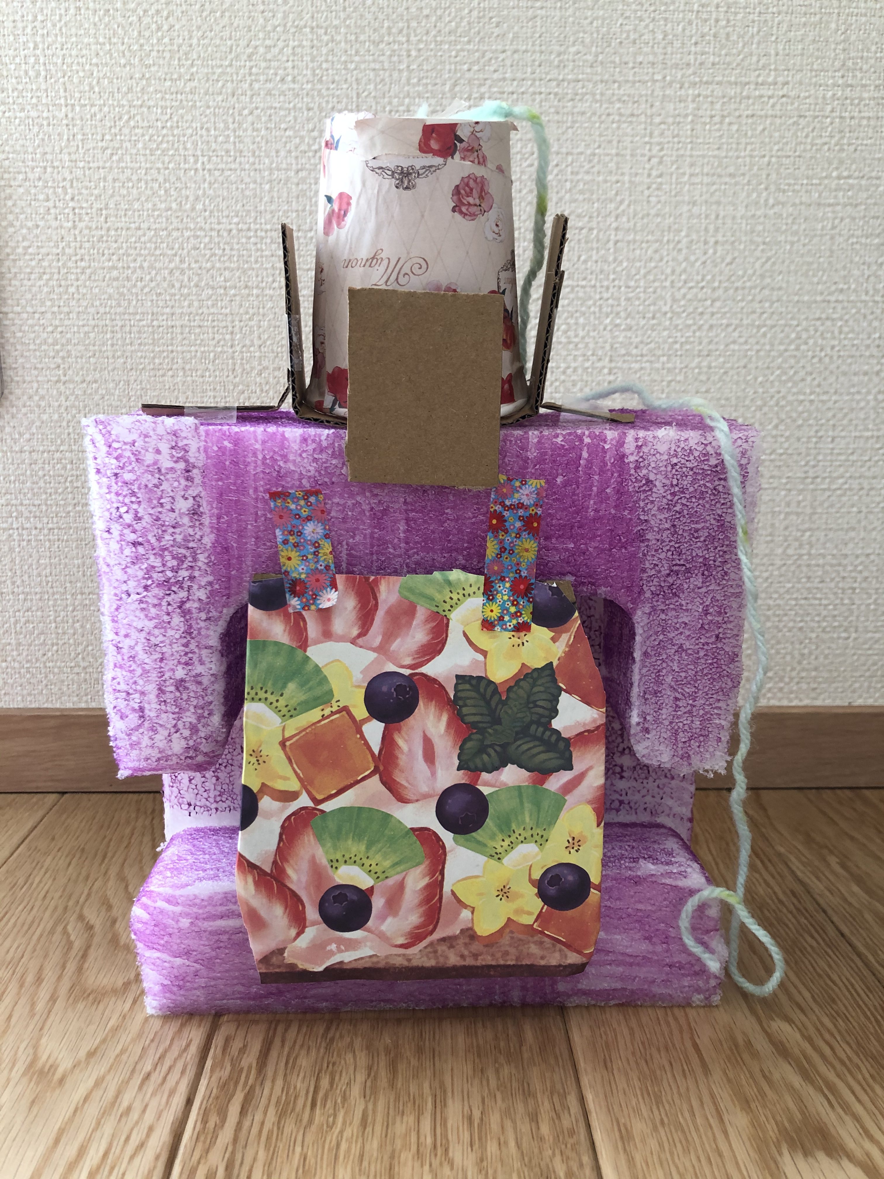 材料を工夫して、好きな色に塗って、電話を作りました。