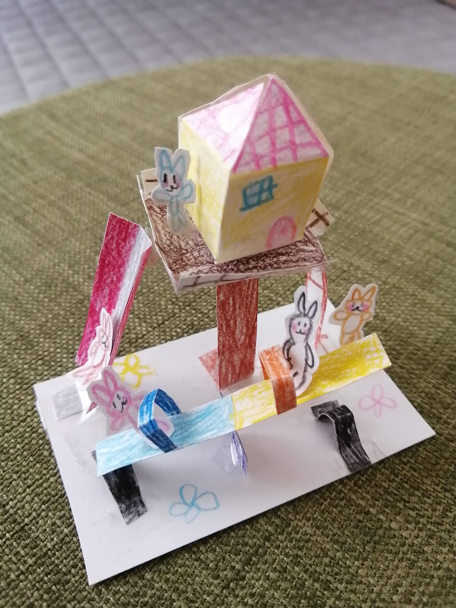 わぁ、うさぎさんたちがツリーハウスの近くで、シーソーや、すべり台で楽しく遊んでいるところを作ってくれたんだね!😲