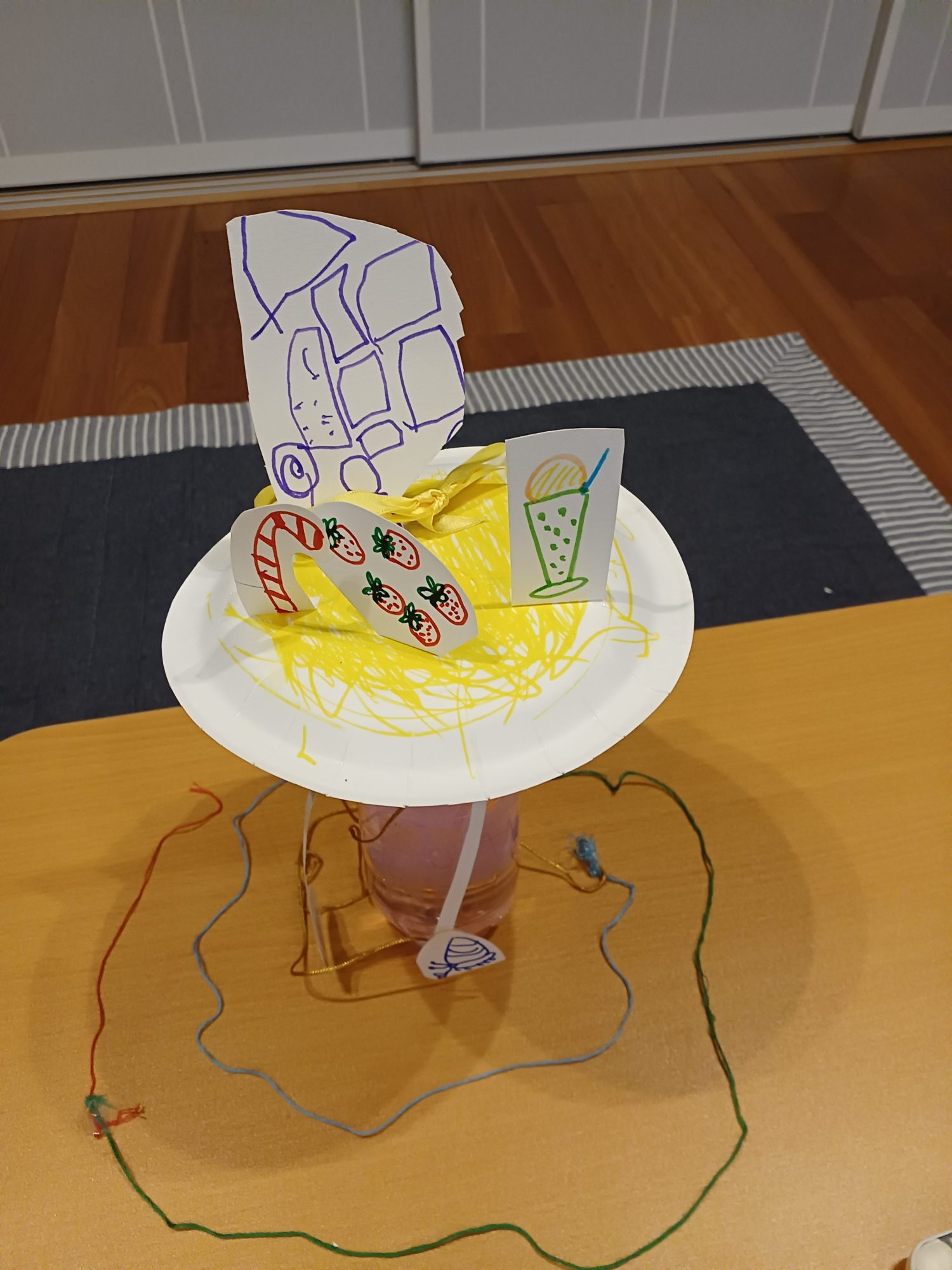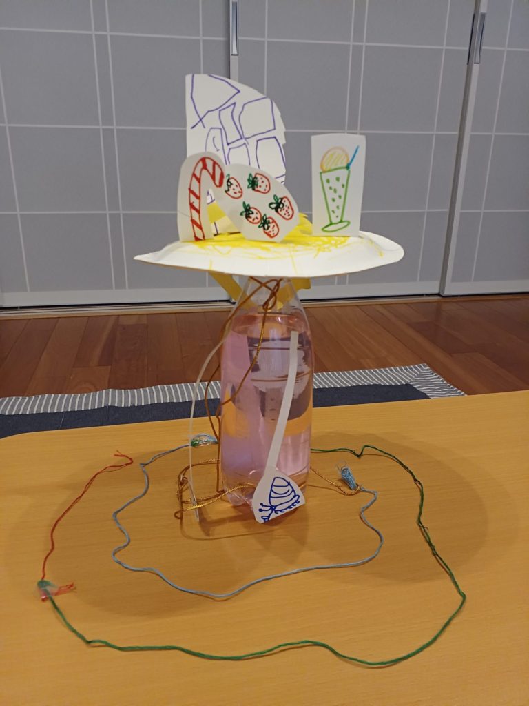色々なお菓子を思い描いて集中してお絵描きしていました。水の色やヒモの長さリボンや飾り方にも楽しんでこだわって作っていたように思います。
