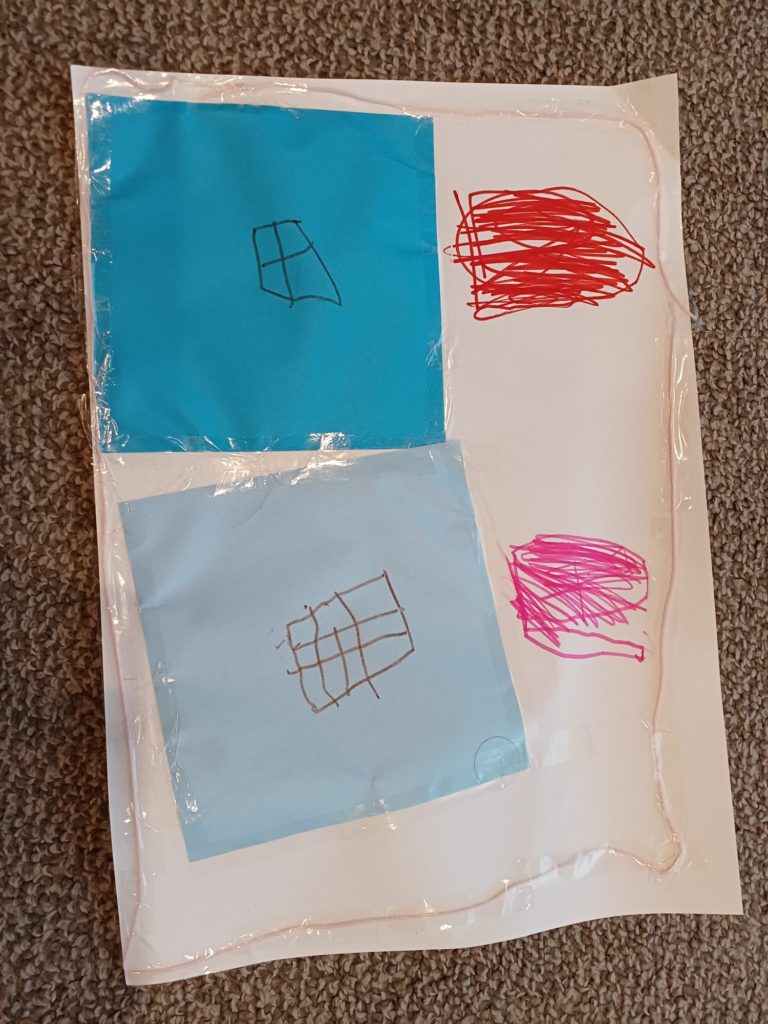 ピンクの毛糸の海でお魚がかくれんぼしているところ。いろんな毛糸を用意していたのですがピンクの毛糸だけをテープでこだわって貼っていました。