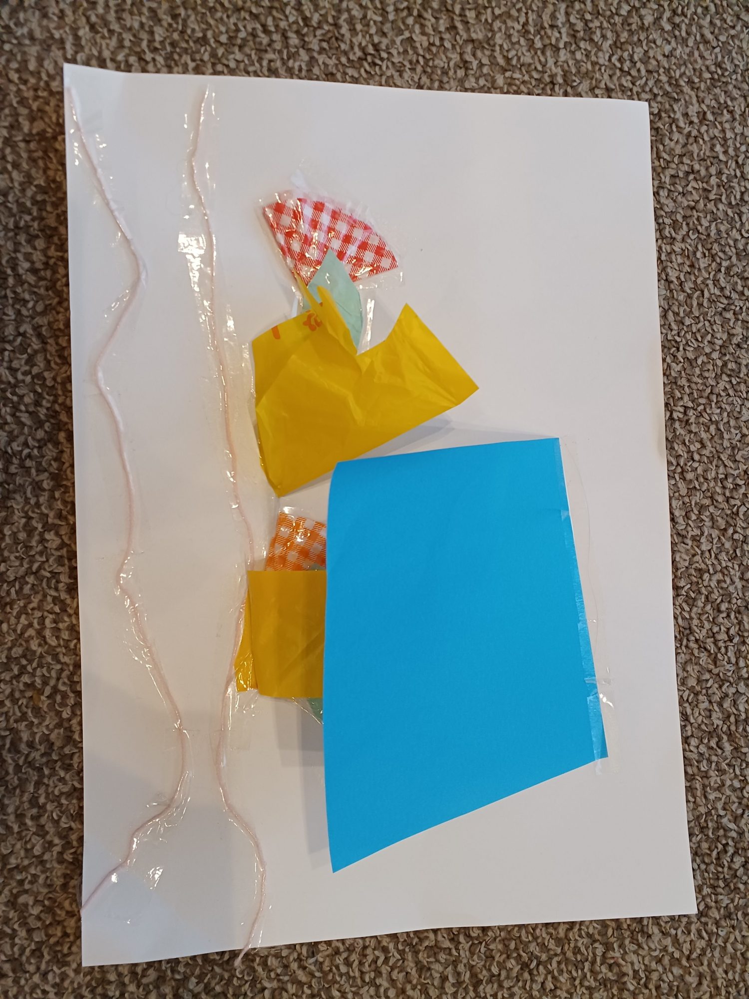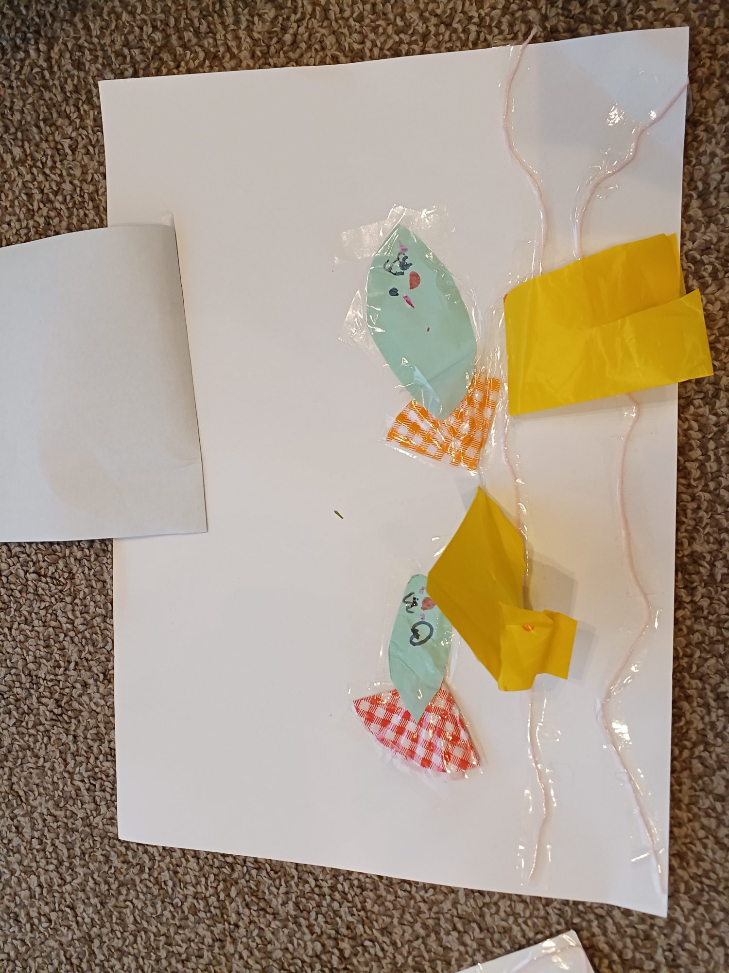 ピンクの毛糸の海でお魚がかくれんぼしているところ。いろんな毛糸を用意していたのですがピンクの毛糸だけをテープでこだわって貼っていました。