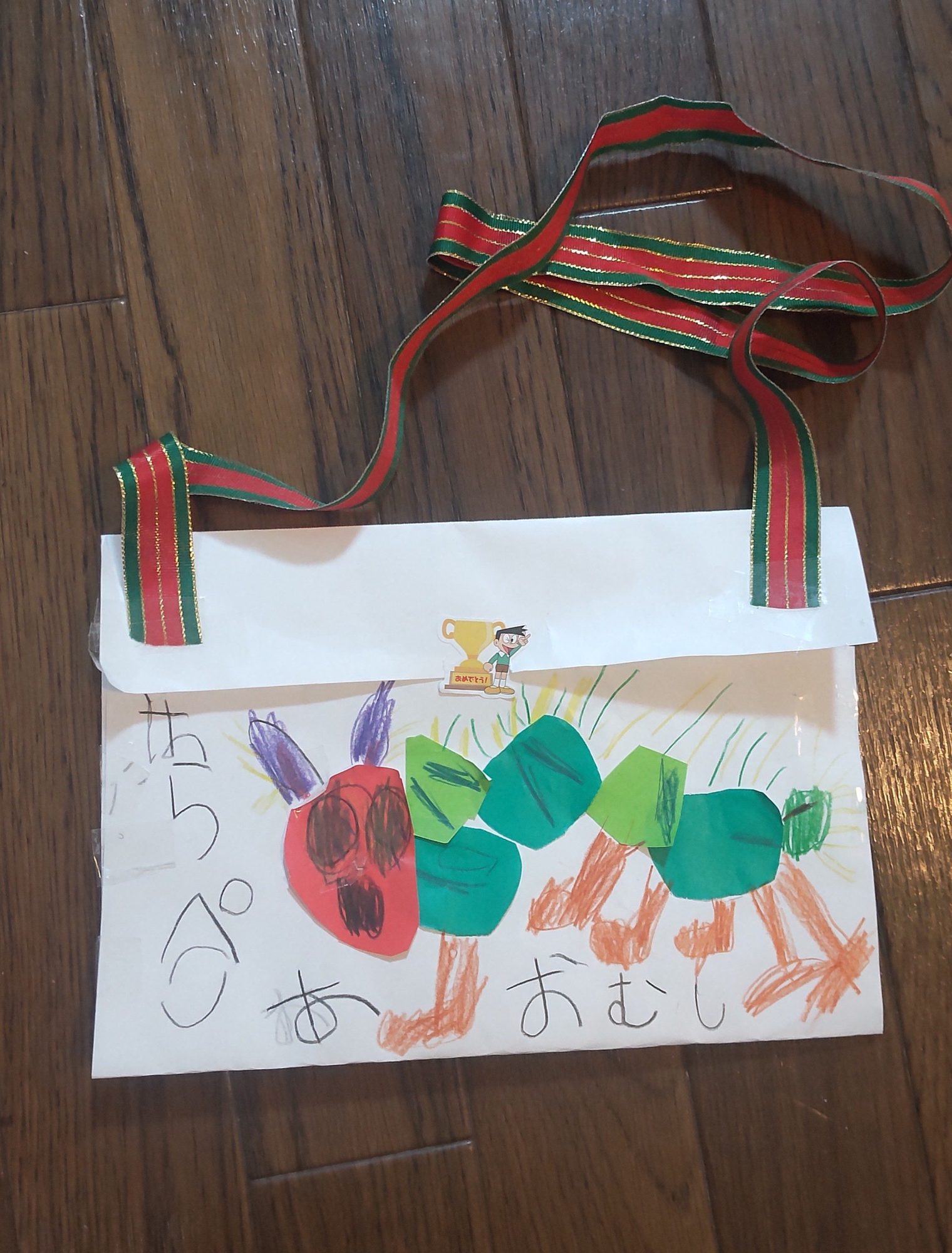 黄緑と緑の折り紙で葉っぱを作っていたのですが、紙に貼るうちに”はらぺこあおむし”に見えてきて…
