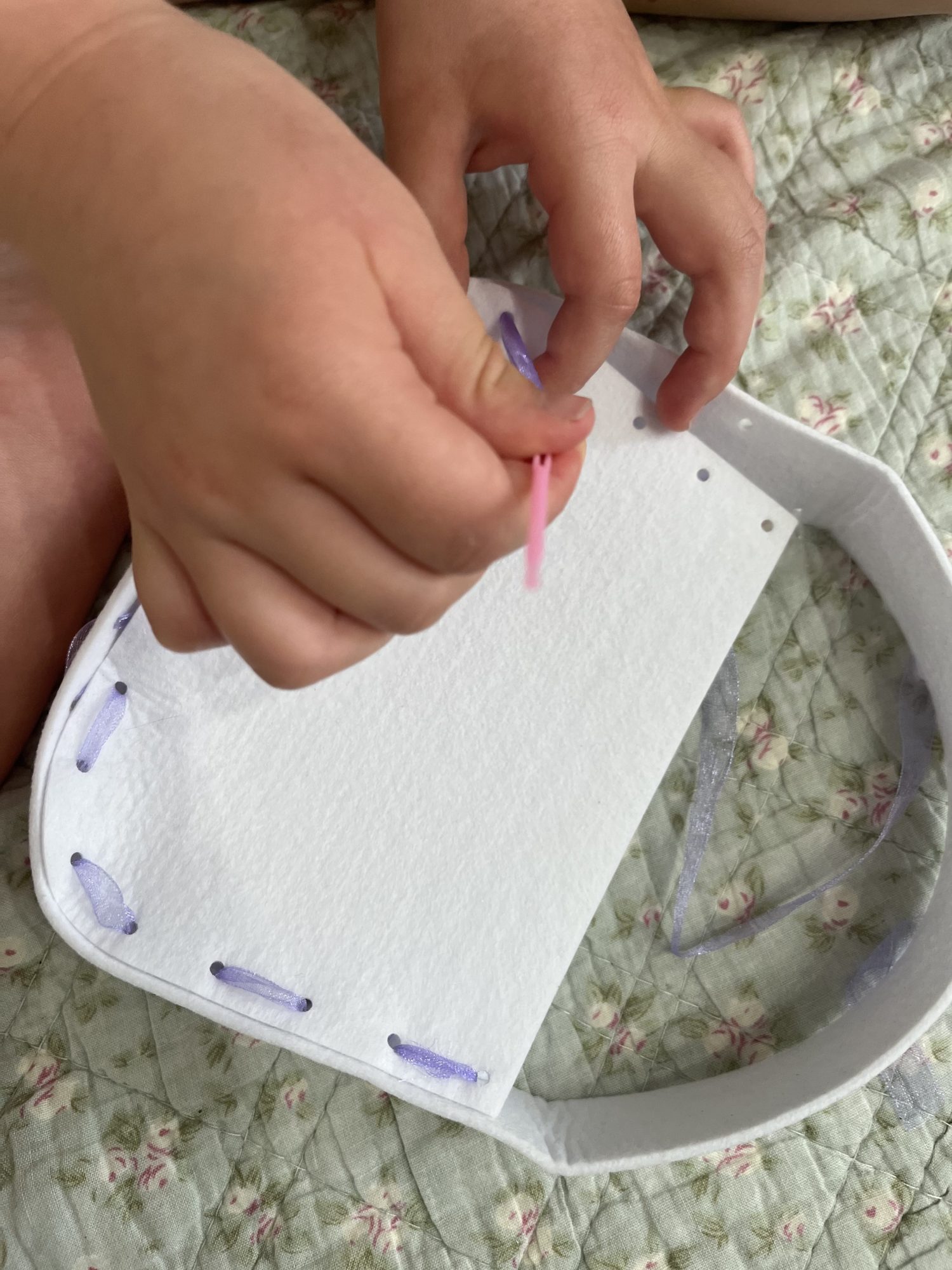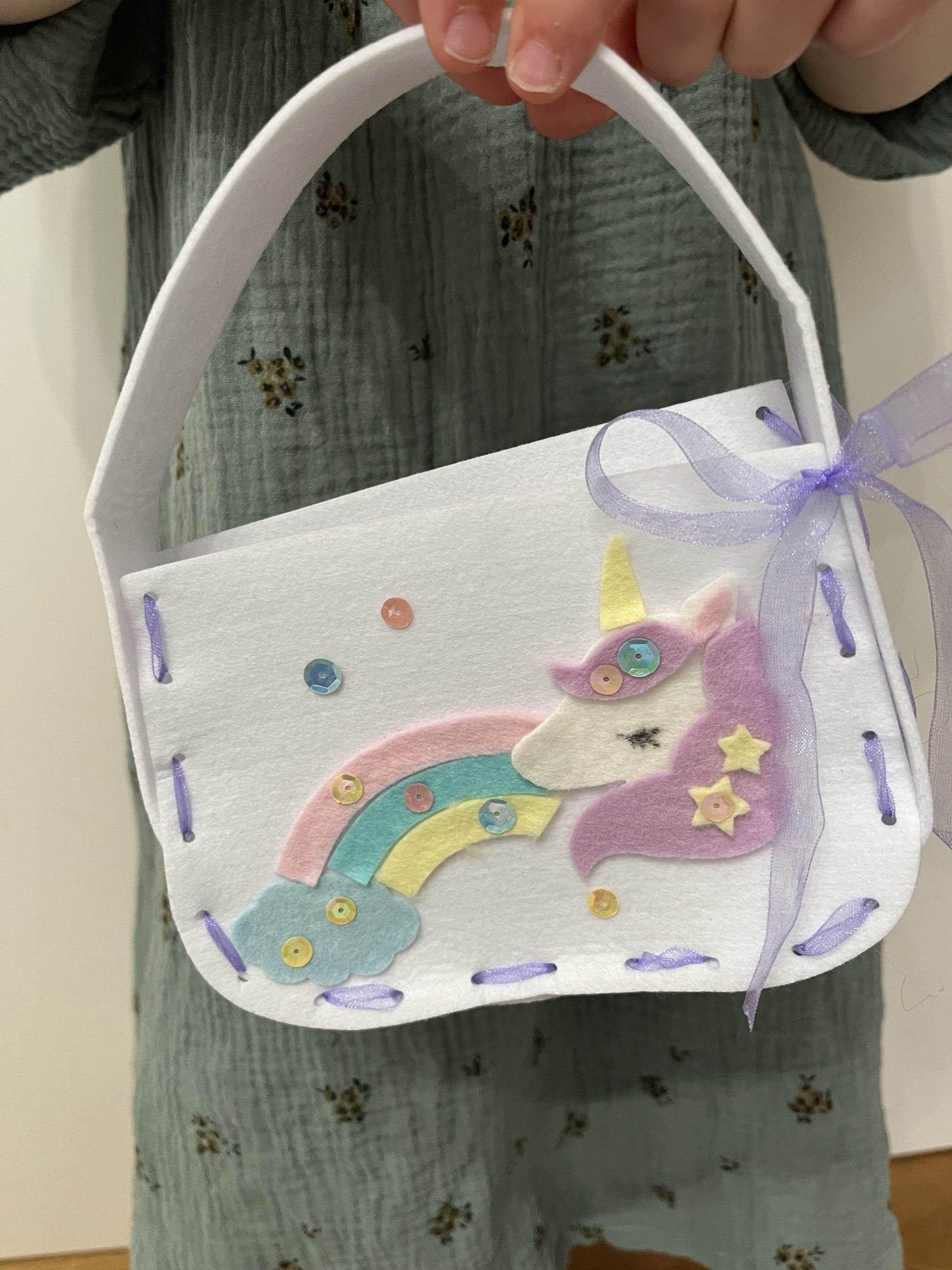 むらさきのキラキラした素材のリボンと、鞄のしろ、そしてユニコーンのかわいらしい雰囲気がベストマッチな
