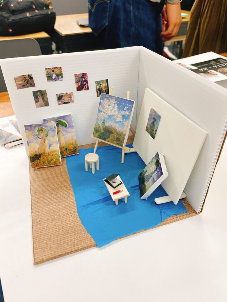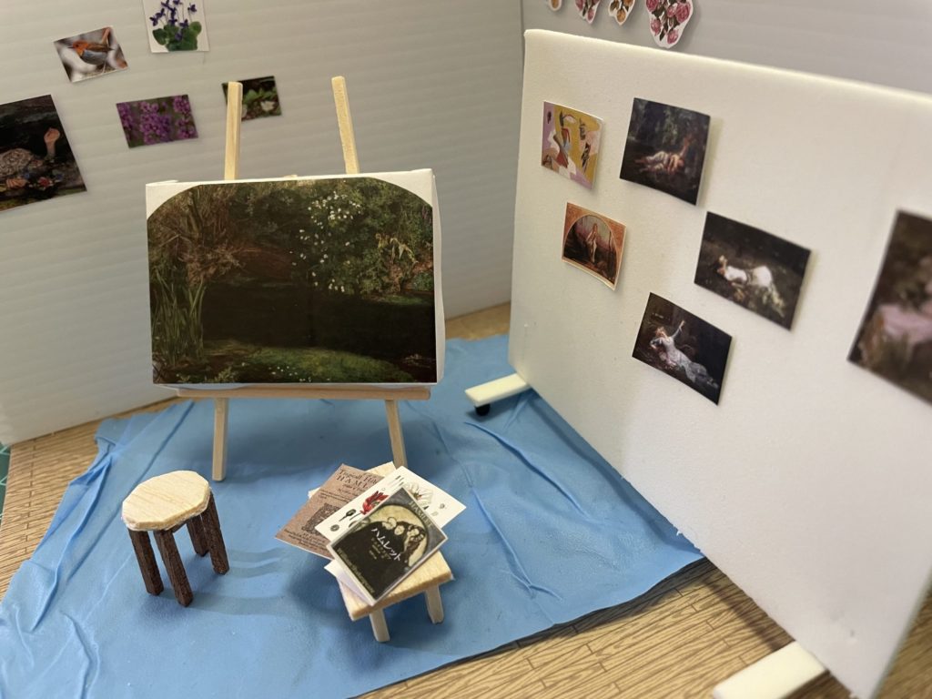 モネの『散歩、日傘をさす女』とミレーの『オフィーリア』を美大生がアトリエで描いているような空間にして、絵の中の女の人を描かなかったら作品はどんなふうに印象が変わるのかなって考える展示にしました〜