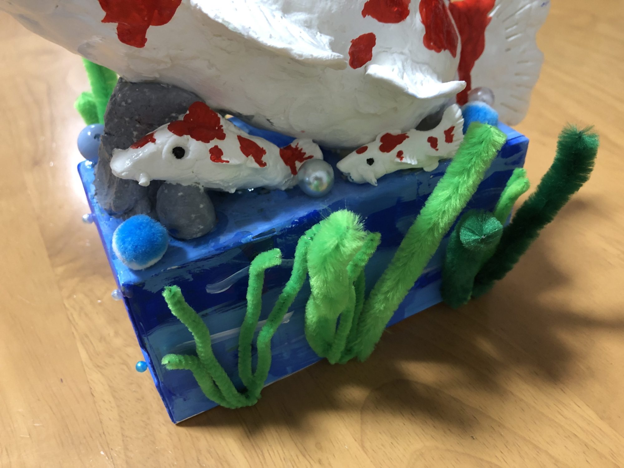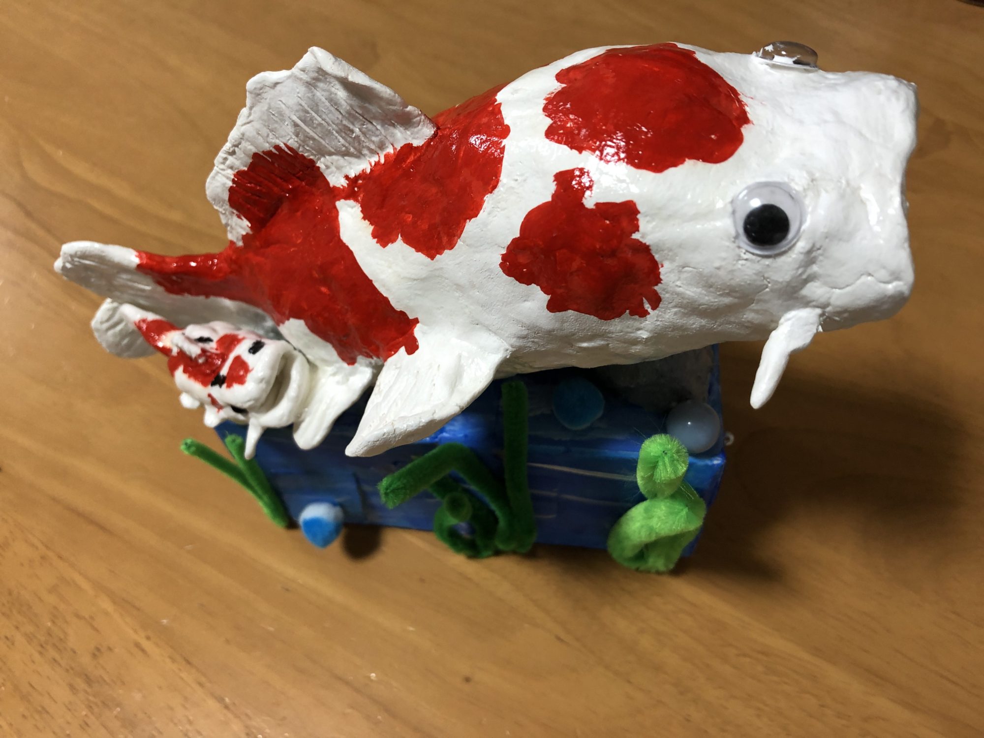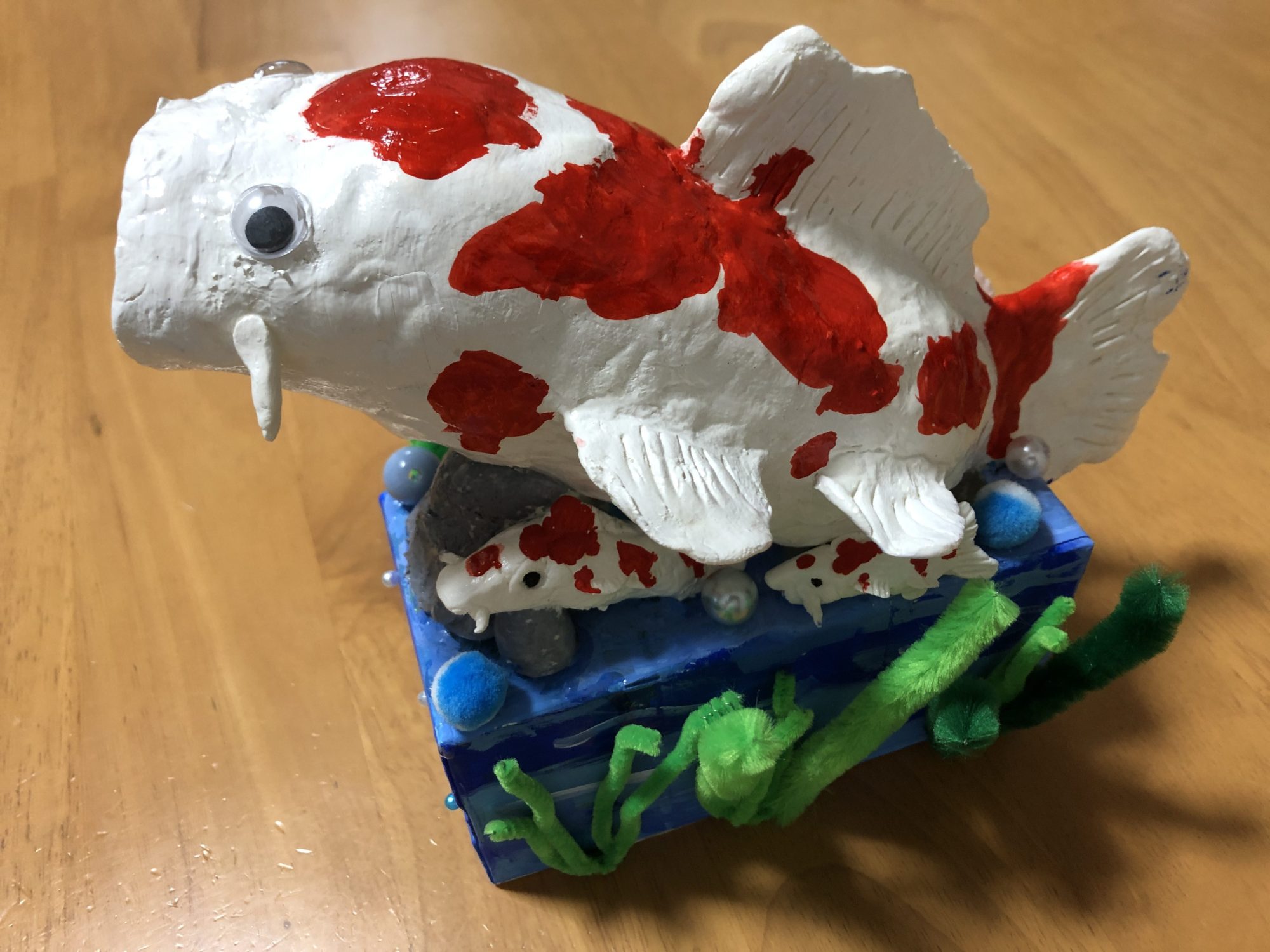 土台は牛乳パック、鯉の中身はペットボトルで、紙粘土をペタペタくっつけながら鯉の形にしていきました。アクリルえのぐで色付けしています。