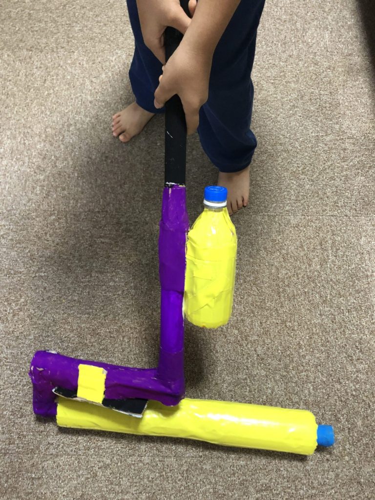 ダンボール、ペットボトル、ラップやトイレットペーパーの芯など、家にある廃材を利用。