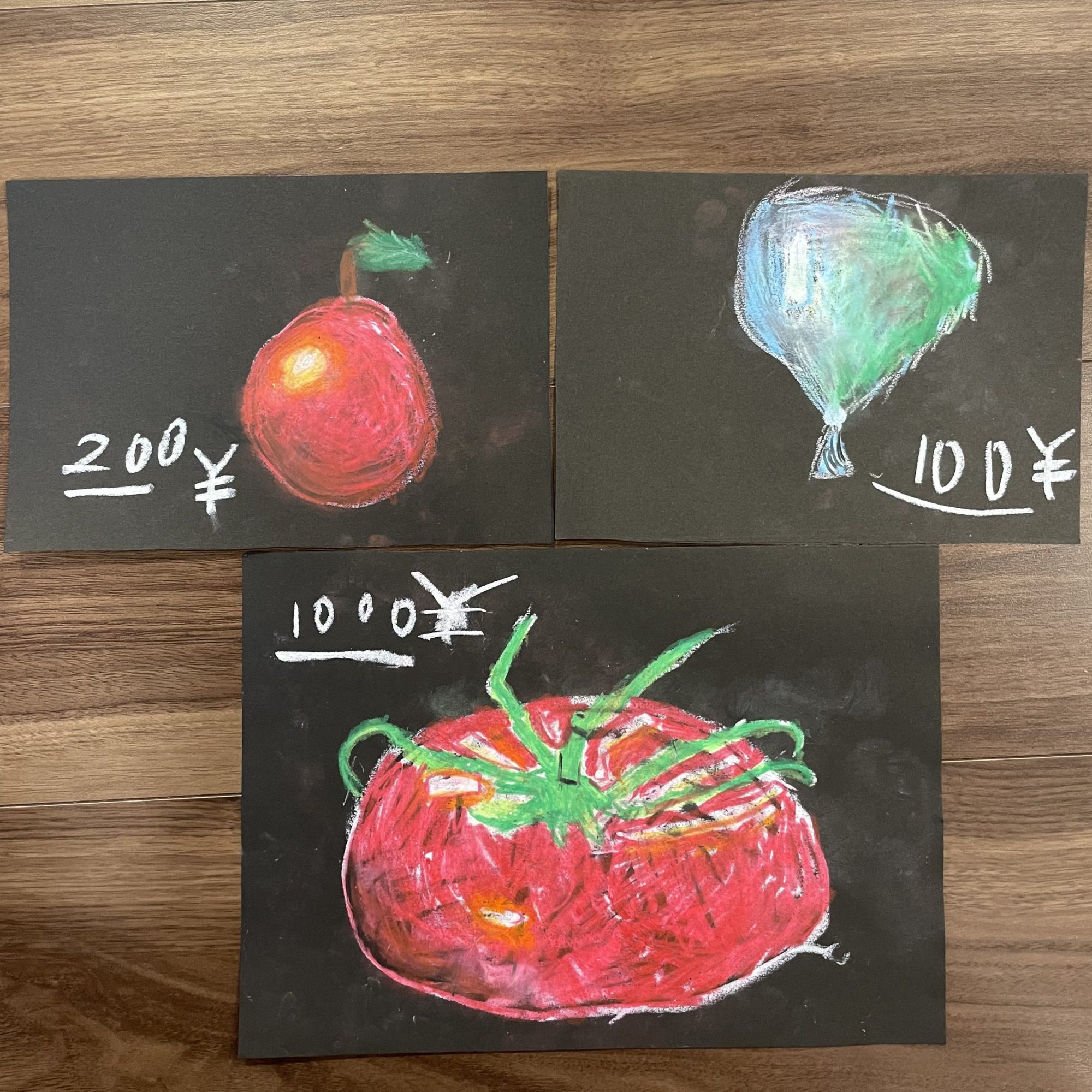 自分の好きなトマトと林檎と風船を、美術教室で先生のお手本を見ながら描いたようでした☺️