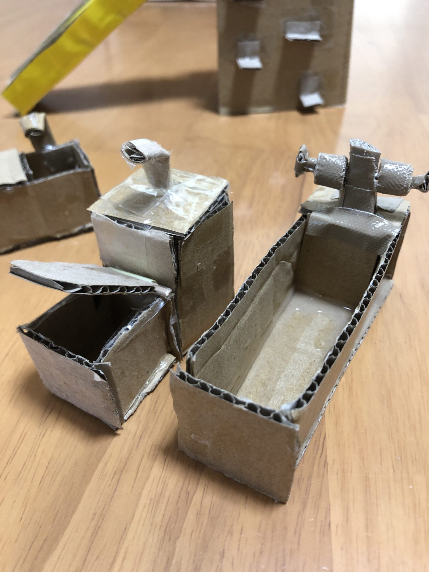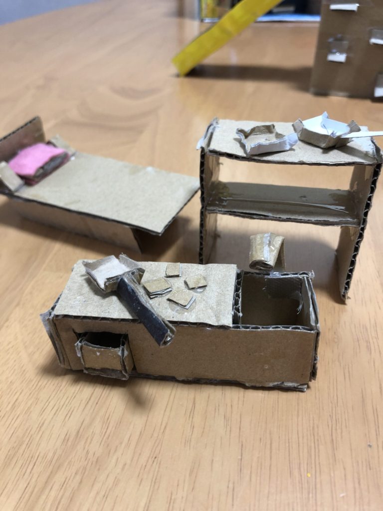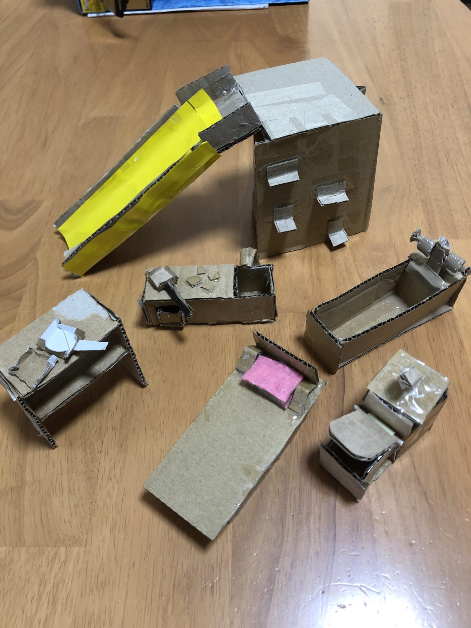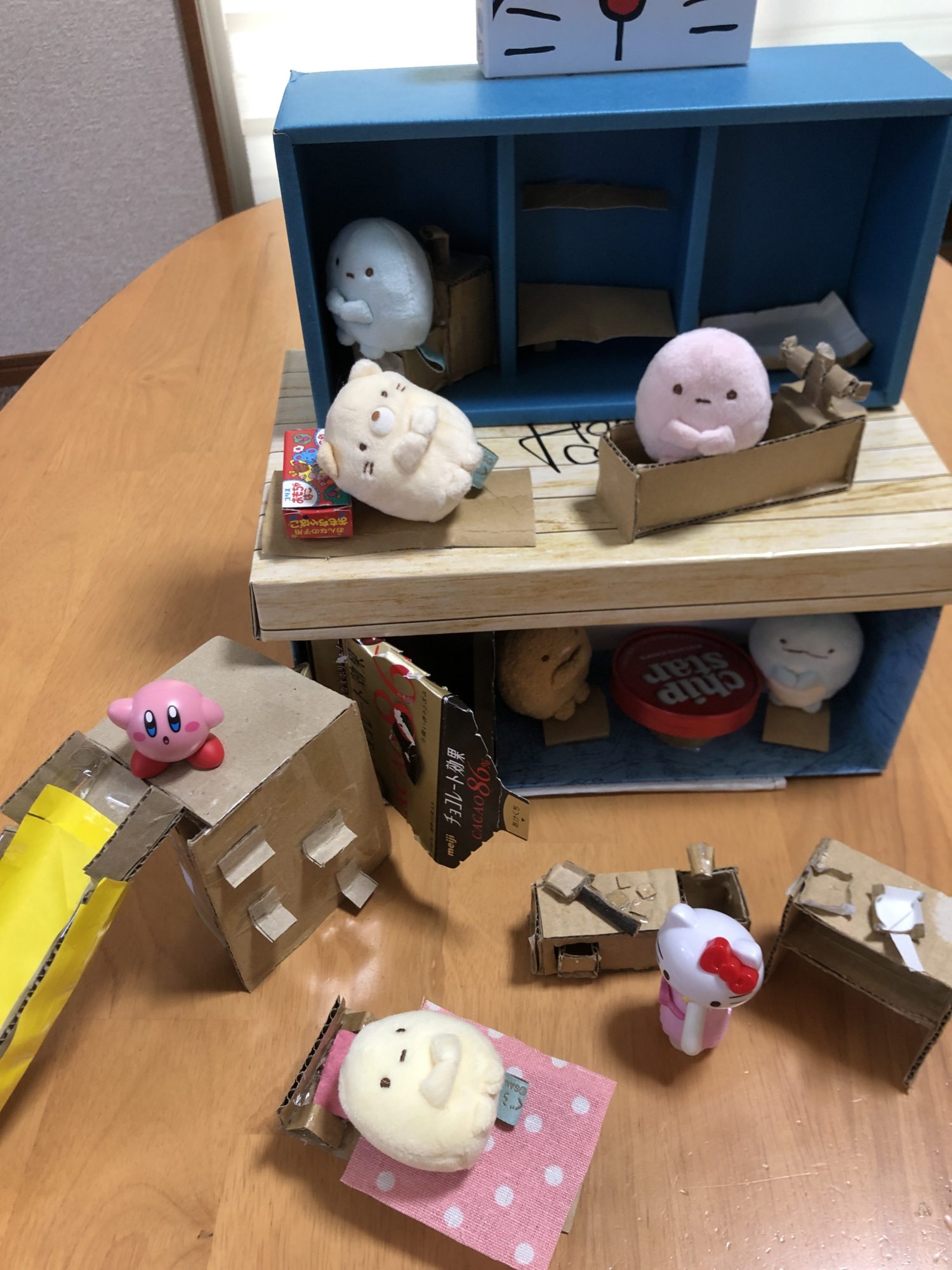 小さなぬいぐるみでおウチごっこ遊びをする妹のために、ダンボールを切り貼りして作りました。