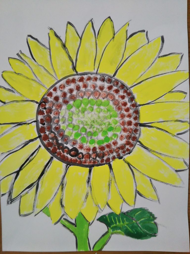 ひまわりのとくちょうてきな、タネをよくかんさつして描いたんだね!茶色と緑のタネがぎっしりとつまっていて、はくりょくまんてんです!