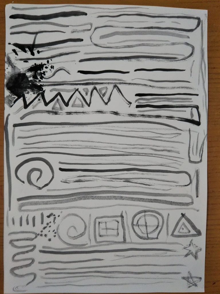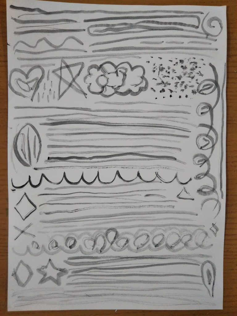 まっすぐな線や、ぐるぐる楽しい線、星⭐️やさんかく▲、ハート💖! 色んなカタチをかけていて、楽しい気持ちが伝わってきます!どんどん色んな筆の使い方を、けんきゅうしてみてね〜!