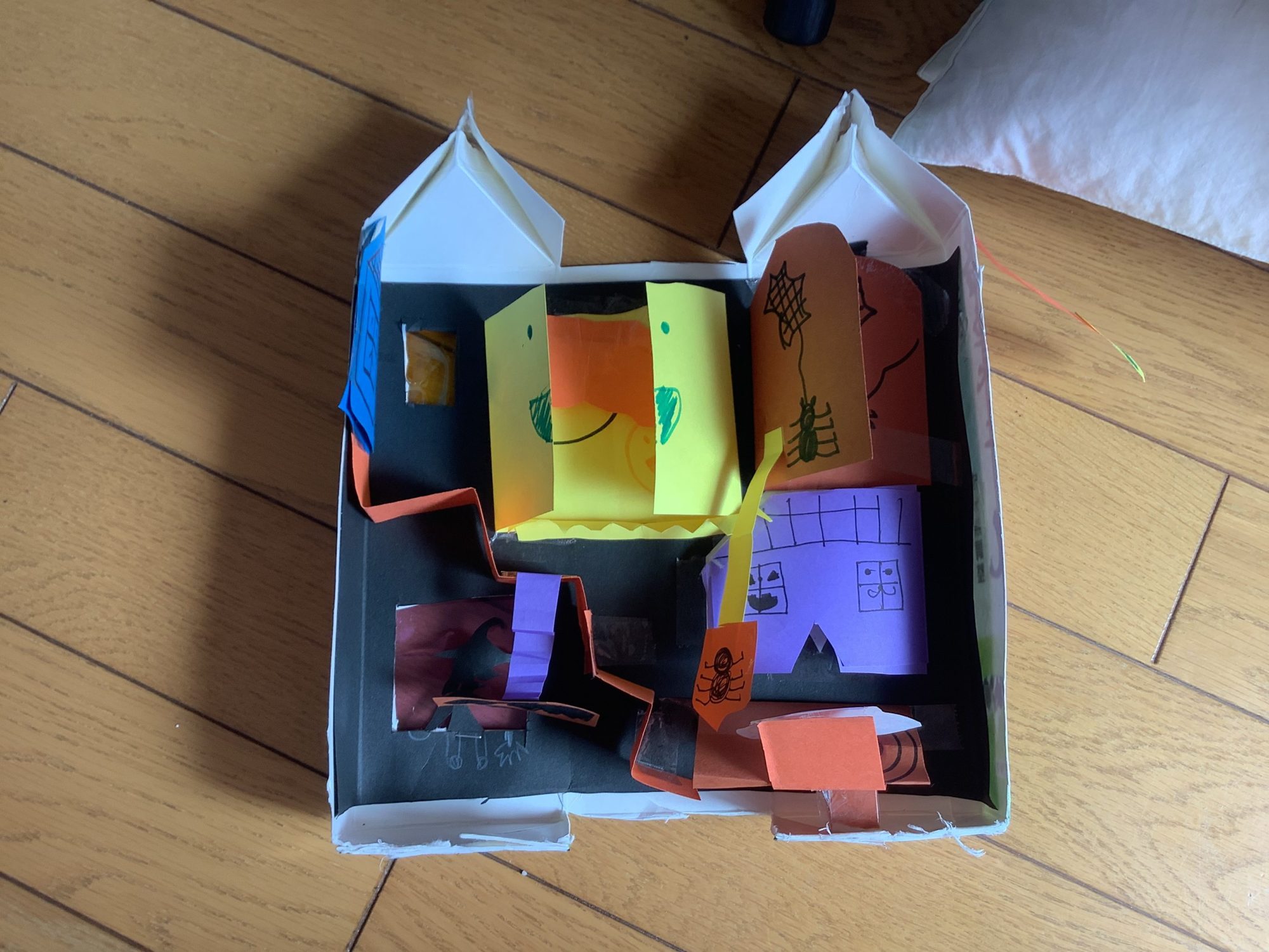 おお!!クモが紙から吊るされている〜!レッスンで見たものだけじゃなくって、akarinさんが自分で「こうやったらもっと面白いかも!」という工夫も施されていて、とっても素敵だ〜✨