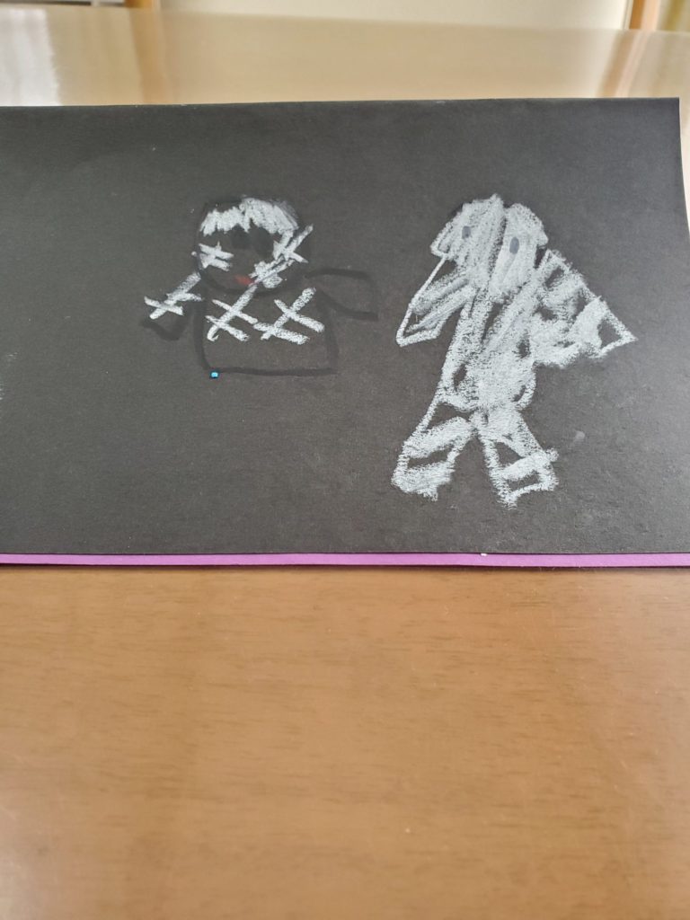足がたくさんのクモやひとつめおばけたちを夢中で描き、先生方の真似がしたく、コウモリや階段をつけてみたり、