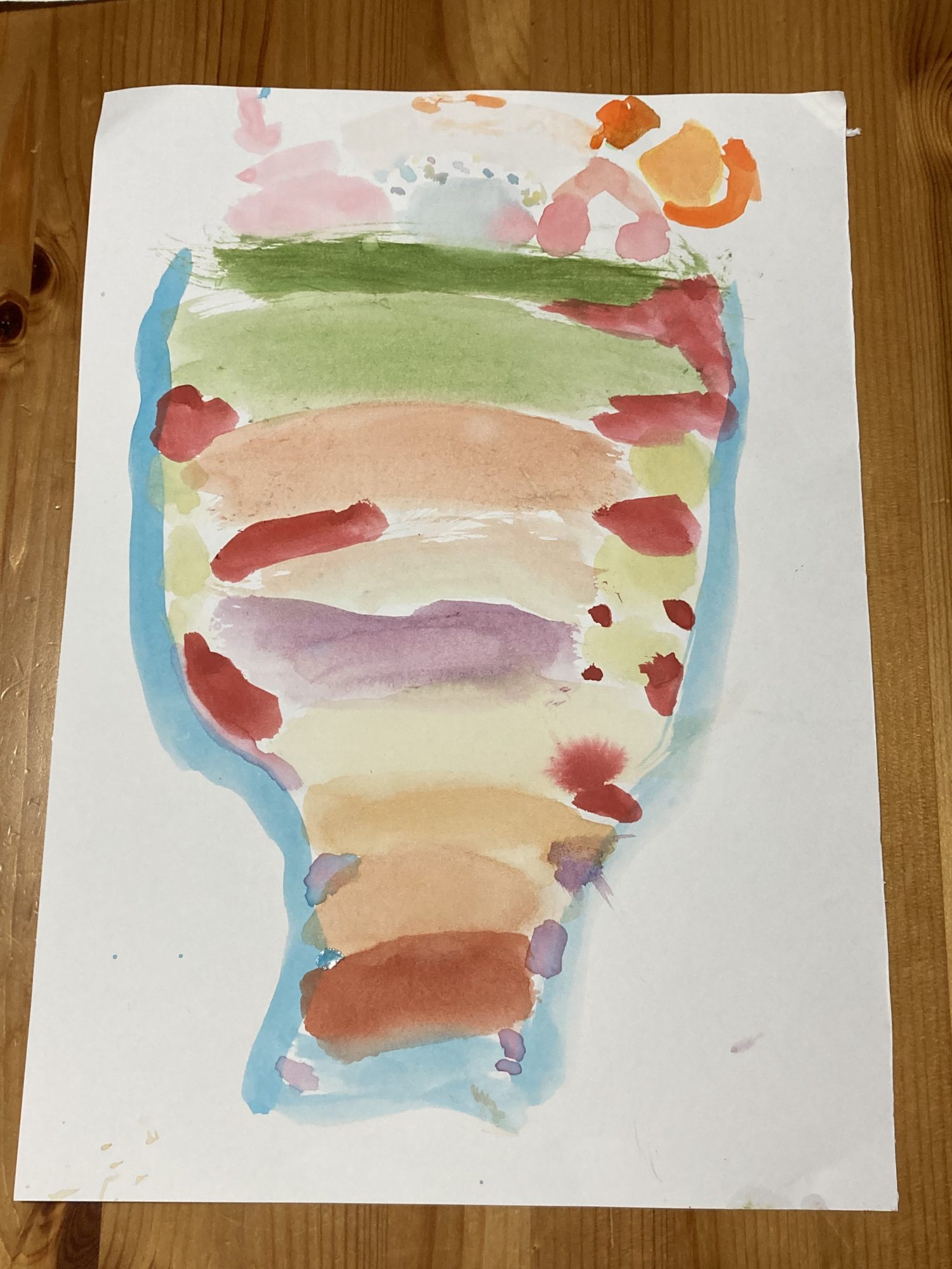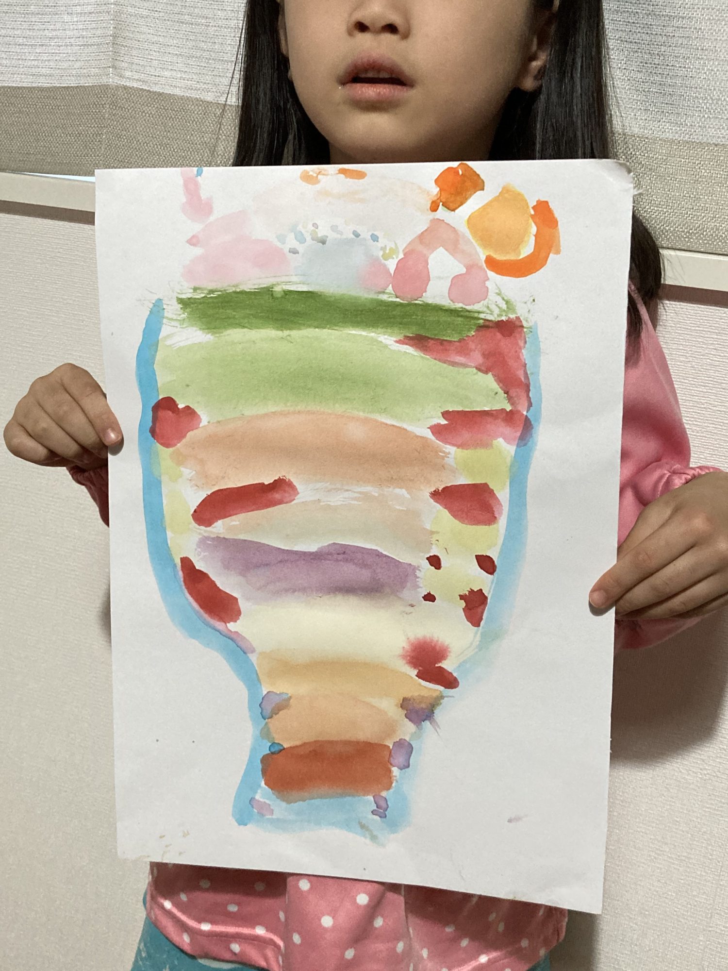 えのぐでかいたクリームがたくさんあって、おもしろいえになりました。(母代筆)