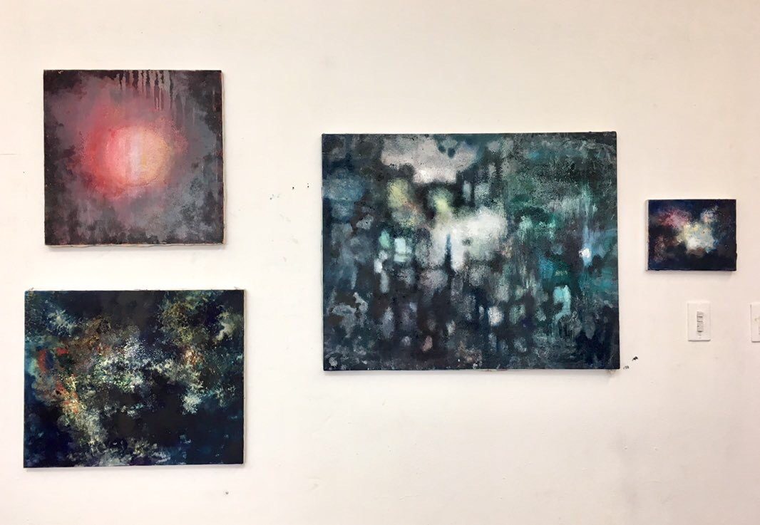 夜の街明かりや月、星の灯りなど夜の光を抽象化した作品群です。夜の濃淡と光の持つ幻想的な印象をキャンバスに留めたく制作いたしました。