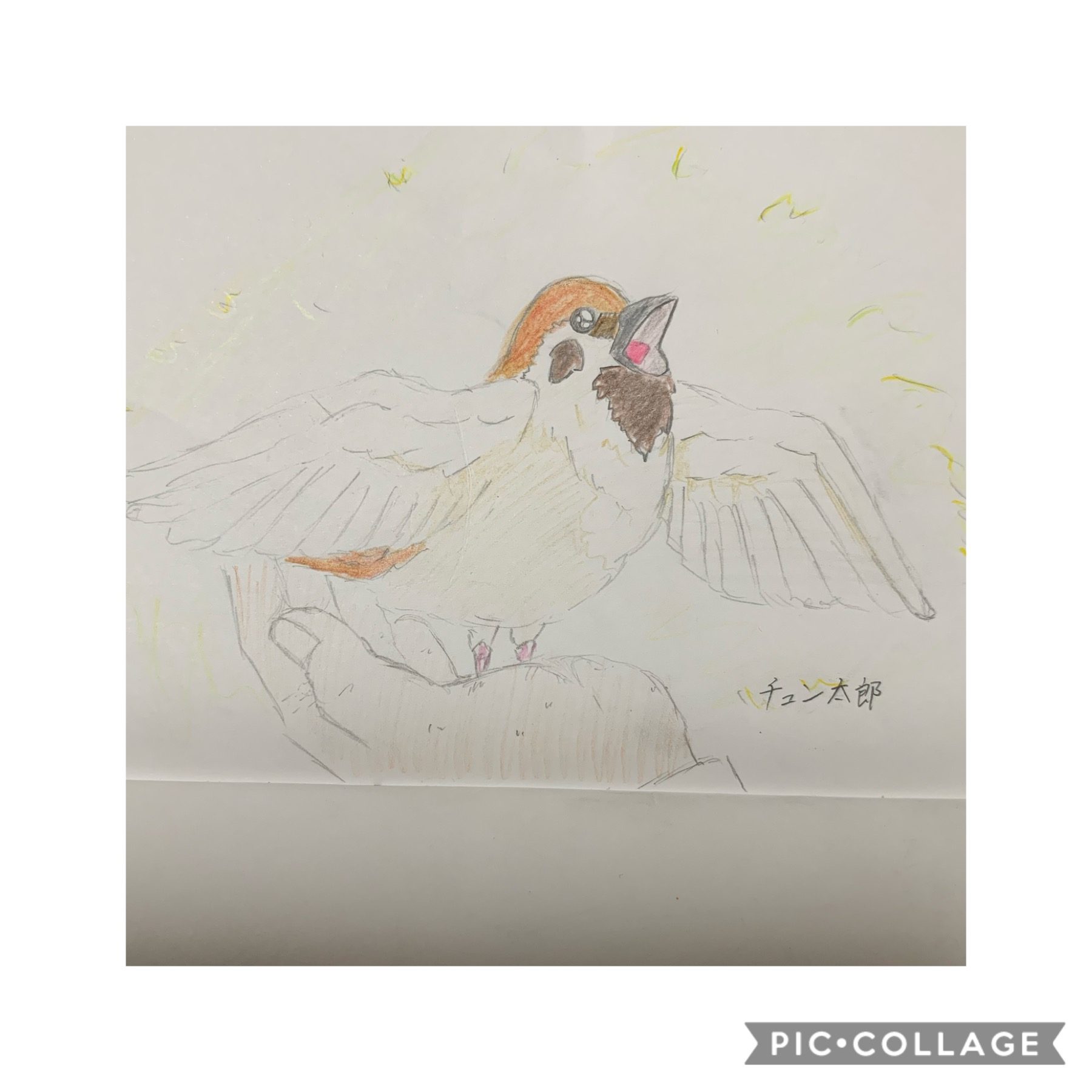 チュン太郎! 鳴き声がきこえてくようなかんじがするね。手に乗っているところは すごくよくかけてますね!