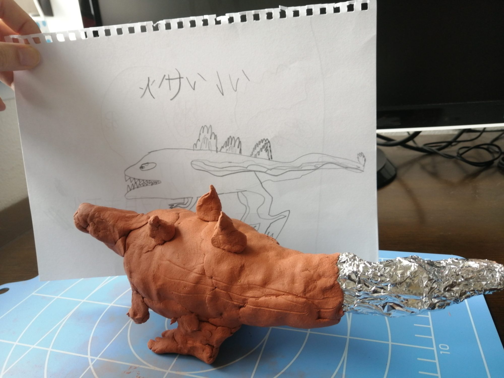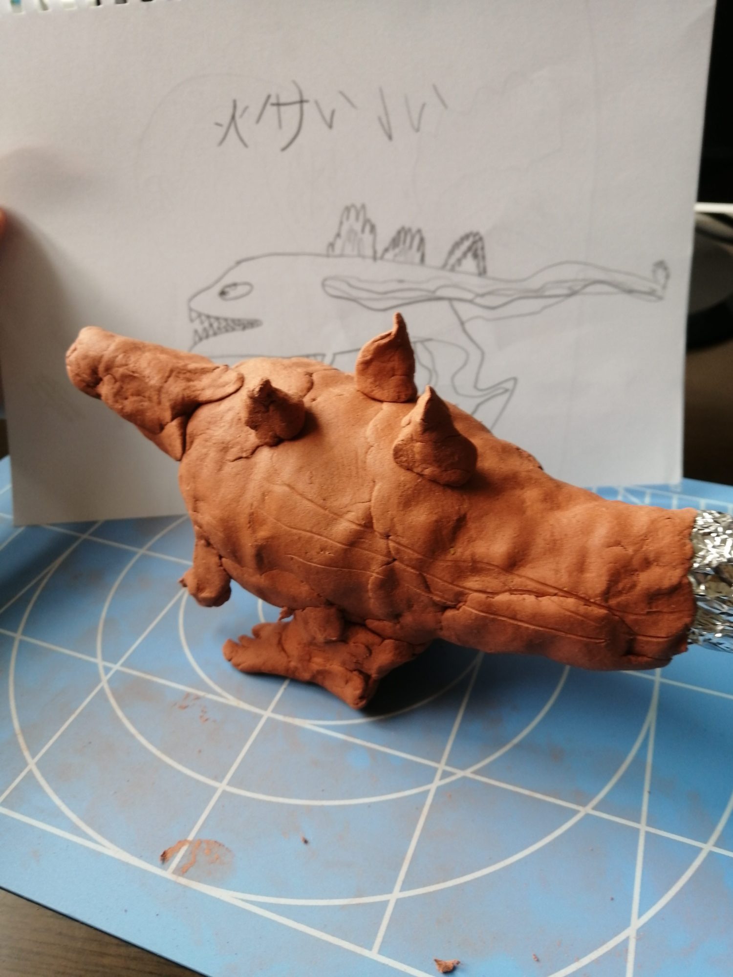足をどうしてもたたせたくて難しかったけど頑張りました。頭も難しかったです。しっぽはアルミホイルで作り、光っているのがかっこよかったので粘土はまかないでそのままにしました。