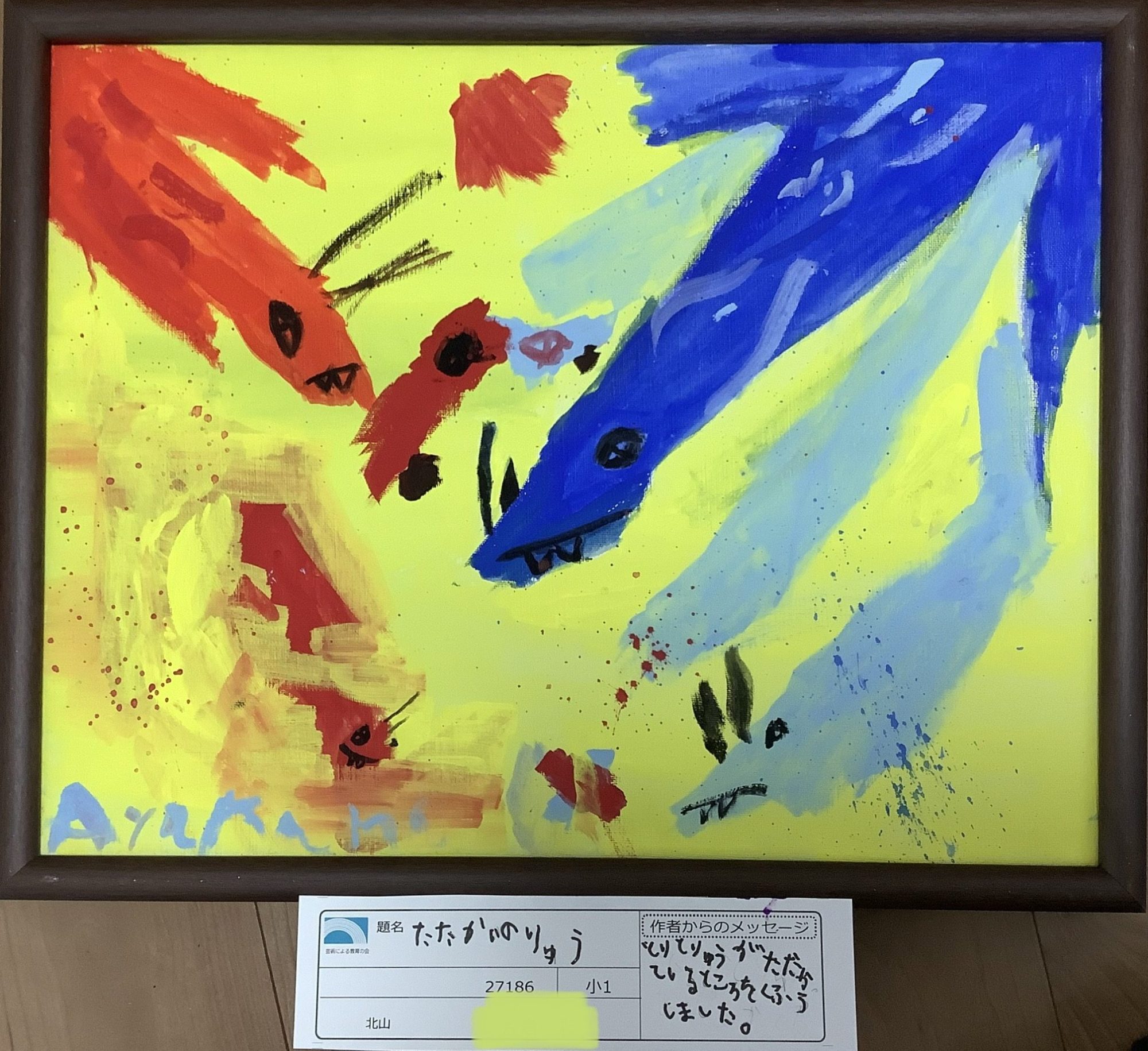 まりん先生 先生2022年12月15日 9:09 AM tnh27542さん!こんにちは。まりん先生です☺️👋 とり と りゅう がたたかっているってスゴい!😳迫力があるね…! どっちが勝つのかな〜 まりん先生はどっちも応援しちゃう…!!🤭 絵の具が勢いよく飛び散ってるところが、 とってもイイね!! 鳥さんと龍がお互いに「負けないぞぉ〜」っていう熱い感情が伝わってくるよ!🔥 カッコイイ作品がかけたね! 素晴らしい!!!👏👏👏 ログインして返信する ↓