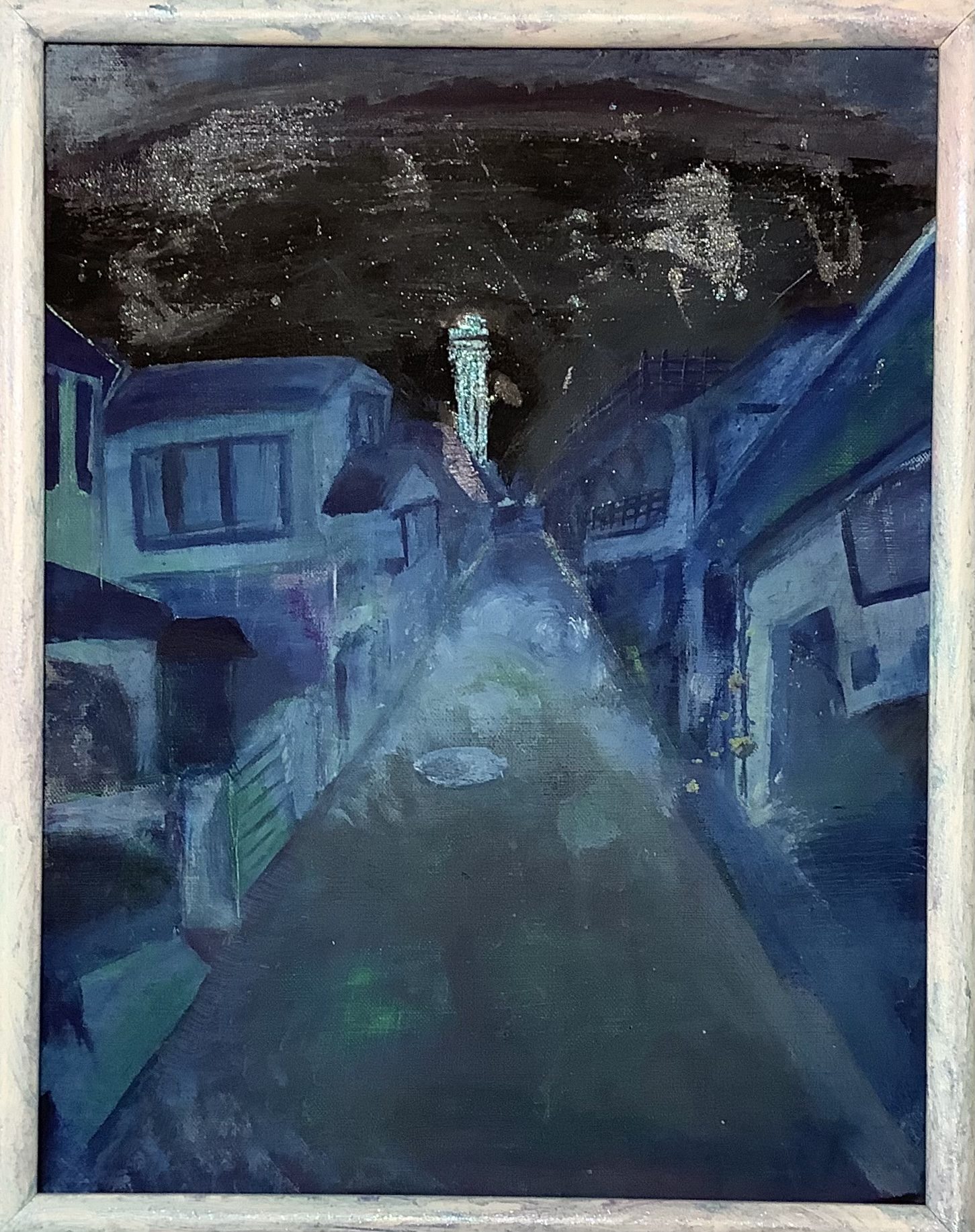 青の下地に緑があって、暗闇の表現がとても印象的です。おそろしいけど神秘的な夜の道の様子が伝わってきました。