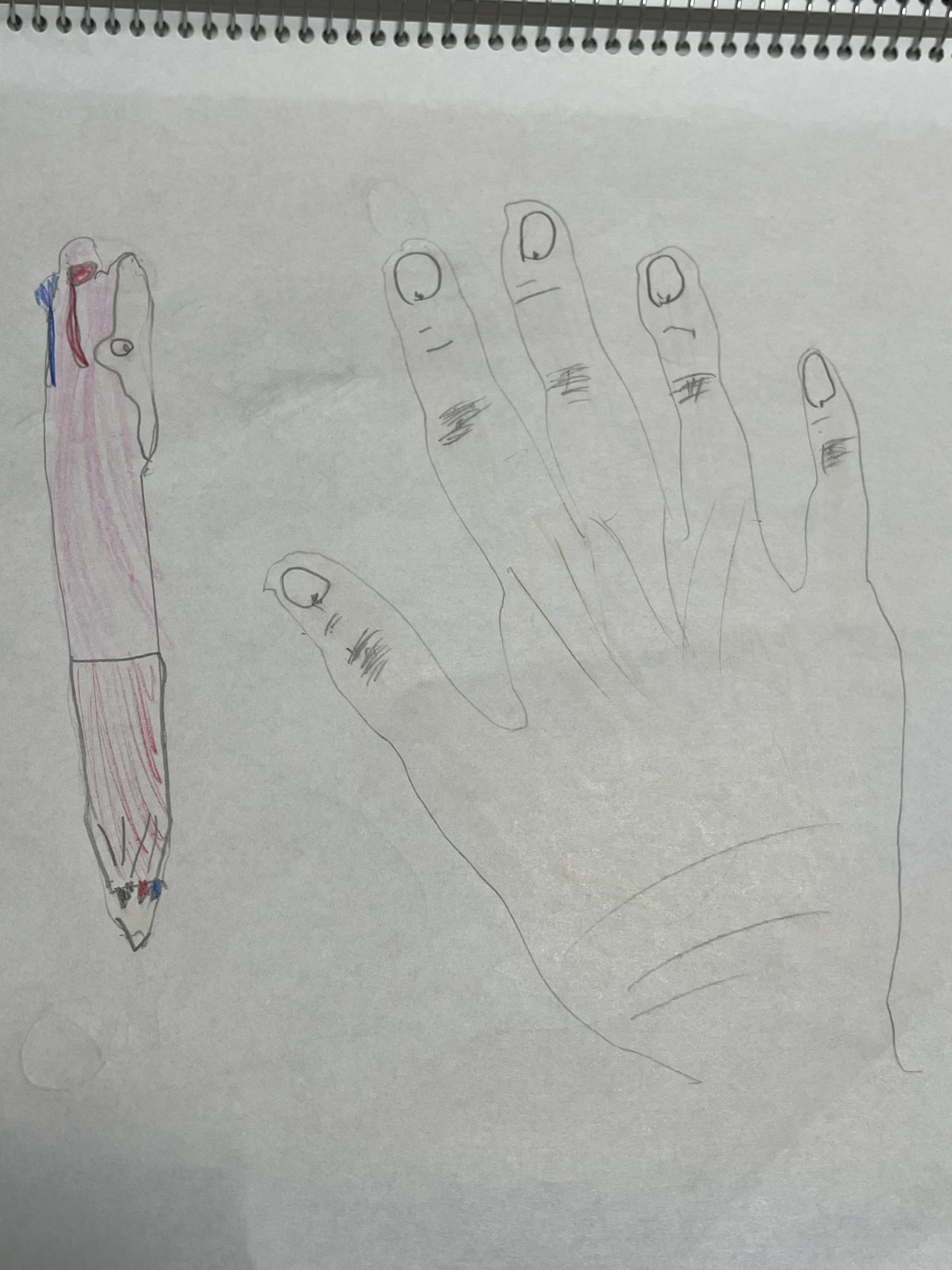 手の形やしわなど難しかったけど、集中してかきました。最後はボールペンや大人の手も観察してかいてみました。